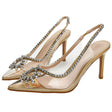The Tigranova Marbelleve Gala Pumps feature a sleek pointed toe design crafted from patent leather, with a buckle closure and a platform for added comfort, and an 8.5 cm (approximately 3.3 inches) heel height.