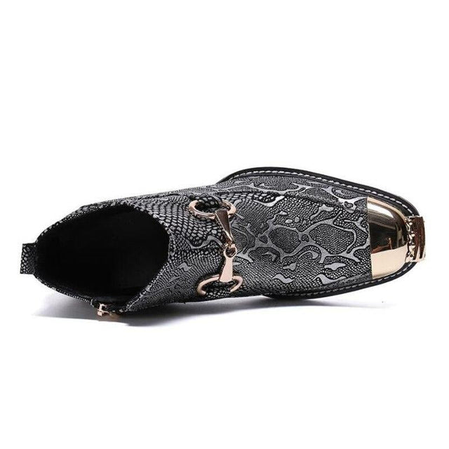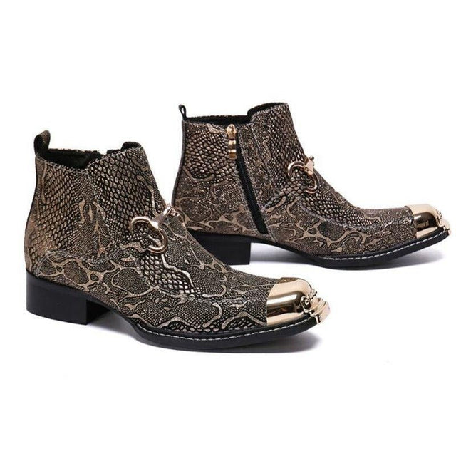 The Serpatura Opulessa Formal Footwear is a dress boot crafted from genuine leather, featuring a distinctive camouflage pattern. It has an ankle boot height with a convenient zip closure and a square toe shape. The low heel measures approximately 0.4 to 1.2 inches, and the boots fit true to size.
