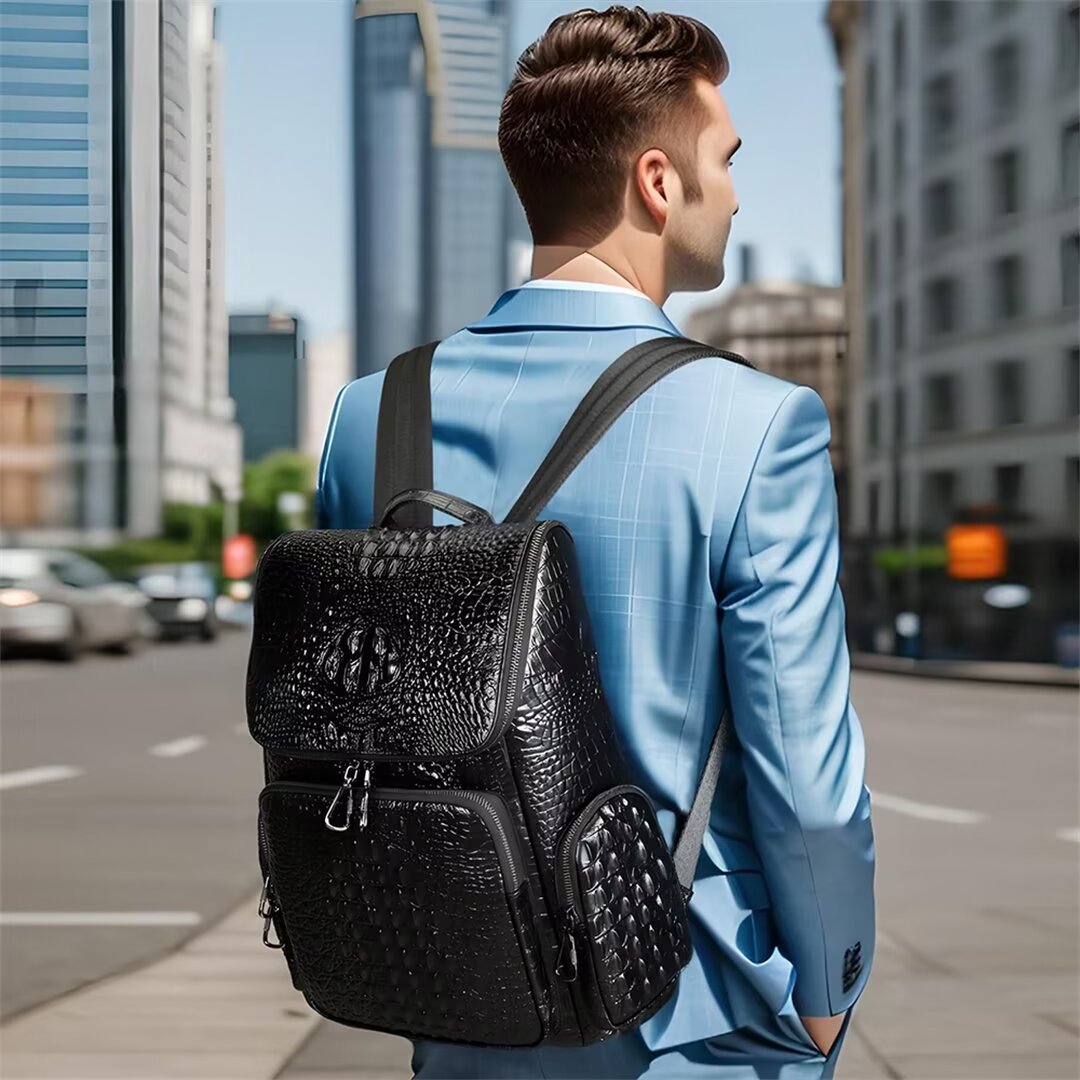 The Diamoré Croctex Carrier is a hard backpack crafted from cow leather with an alligator pattern, featuring a secure zipper closure and a well-organized interior that includes a slot pocket, cell phone pocket, zipper pocket, key chain holder, and compartment.