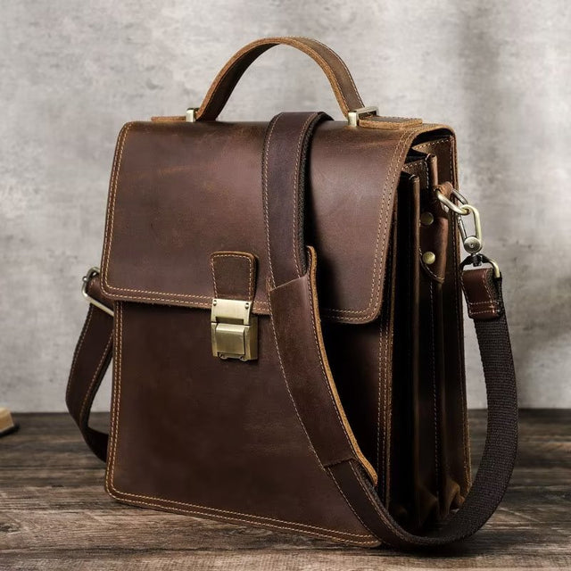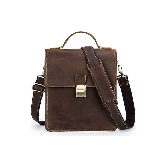 The Silvareign Office Satchel is crafted from genuine cow leather, featuring a solid pattern and a soft structure. It measures approximately 11.4 inches in height and 9.8 inches in width, designed as a versatile messenger bag.