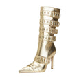 The Ostarnuxe Luxe Event Boots feature a pointed toe design with a thin heel measuring approximately 3.1 to 3.9 inches, crafted from PU material for the upper, insole, and lining, and secured with a buckle closure. The outsole is made of durable rubber, and the boots fit true to size.