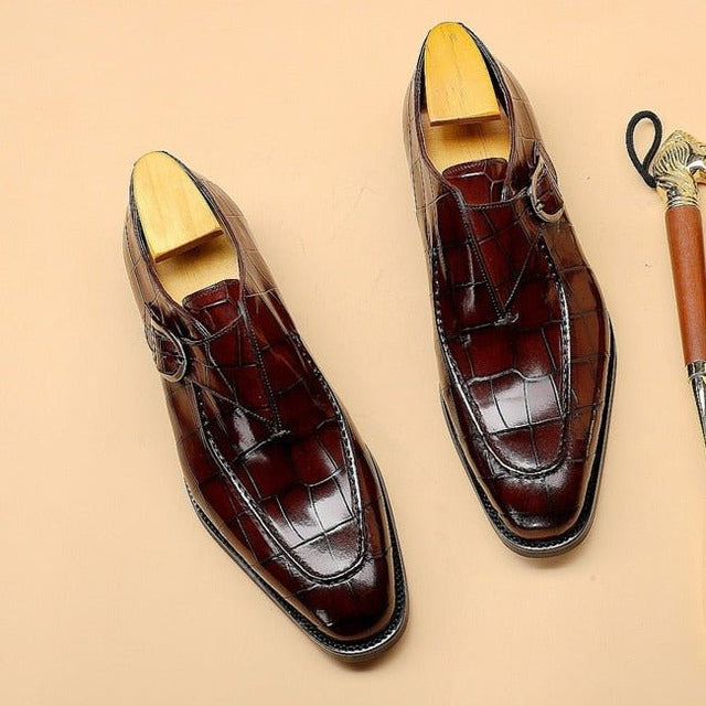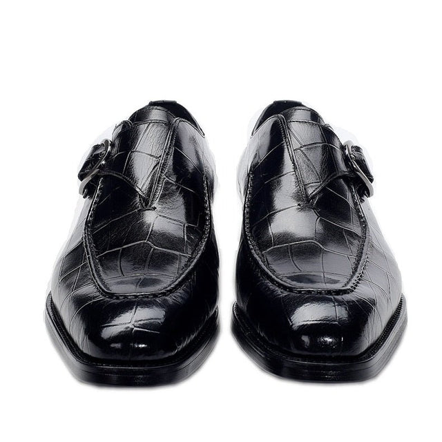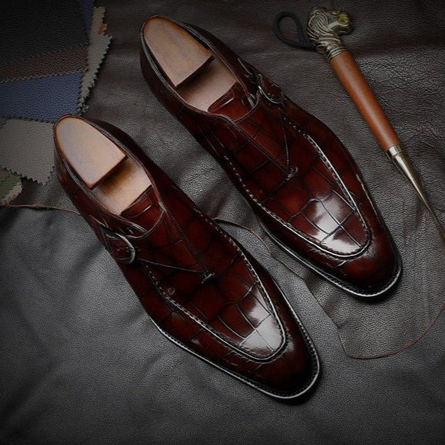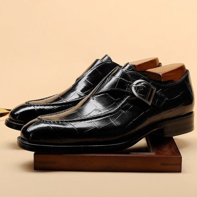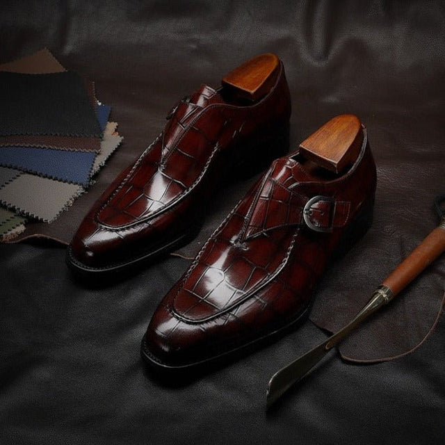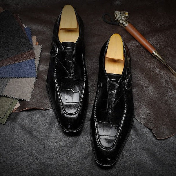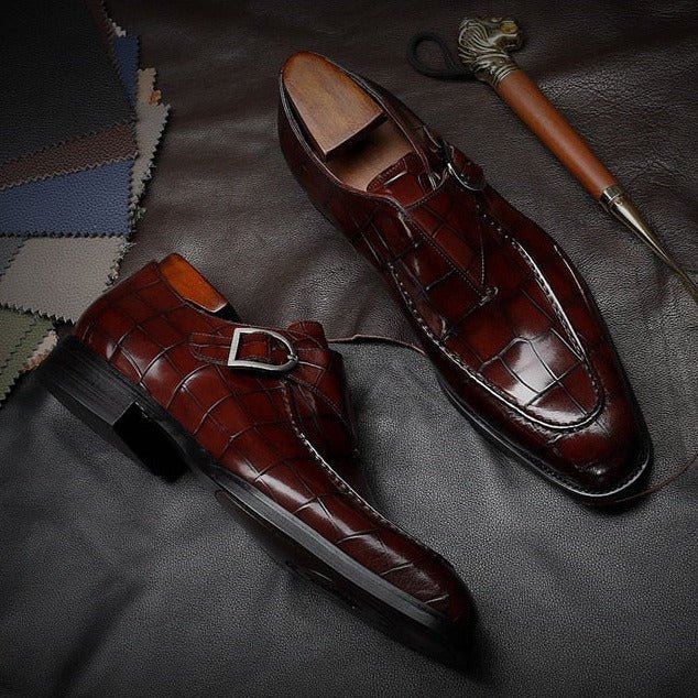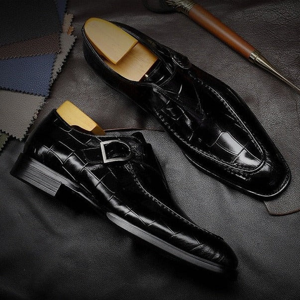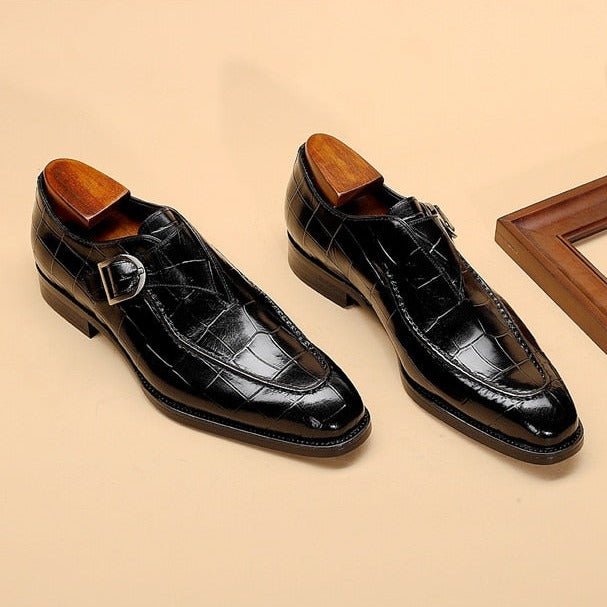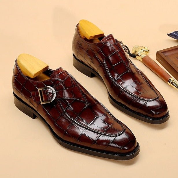 The Luxalon Crocodile Monk Footwear features genuine cow leather with a solid pattern, a slip-on closure, and a pointed toe design, embodying the classic style of brogue shoes.