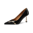 The Auburnyx Ebonique Office Stilettos feature a genuine cow leather upper with a sheepskin lining, a high thin heel ranging from 2 to 3 inches, and a pointed toe design. These slip-on heels include a latex insole and a rubber outsole, offering a fit that is true to size.