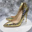 The Opulessa Serpatura Event Heels feature a microfiber upper, a super high heel height of over 3.15 inches, a slip-on closure, and a pointed toe design, offering a true-to-size fit.