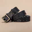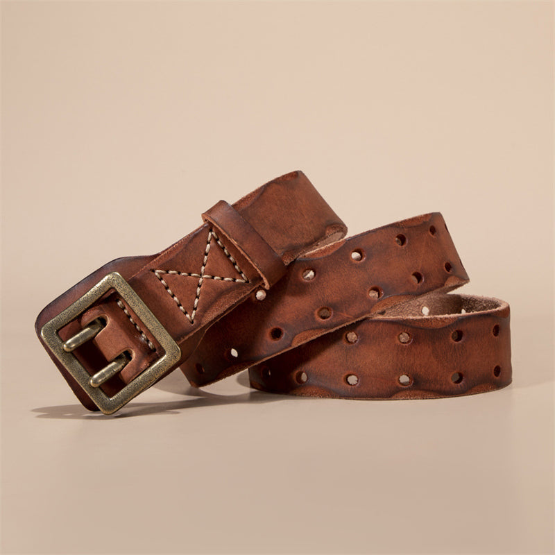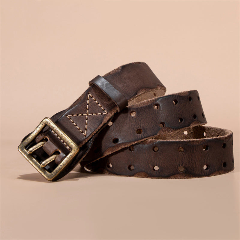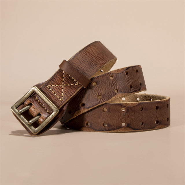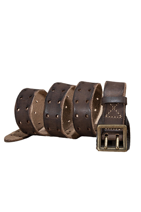 The Luxalon Serpatura Buckle Belt features a solid pattern crafted from durable cowskin, complemented by a copper buckle, and measures 1.5 inches in width.