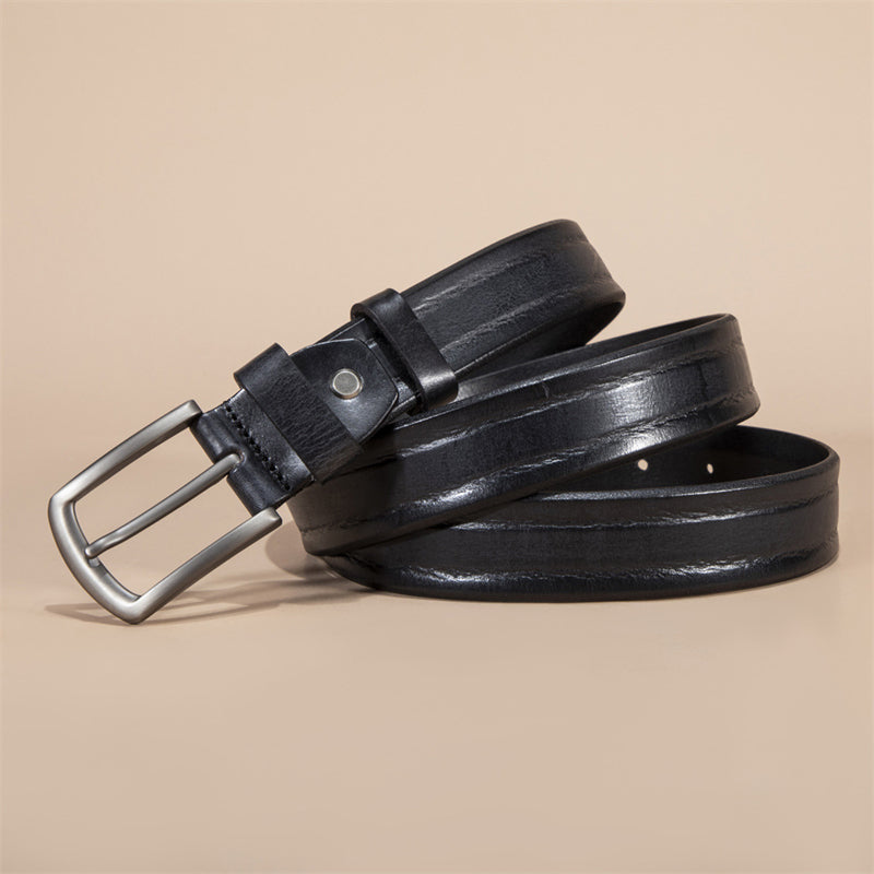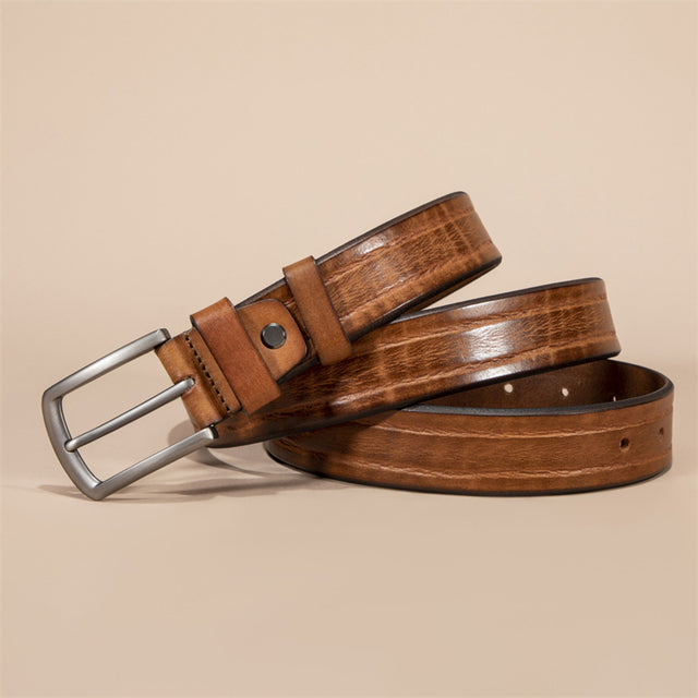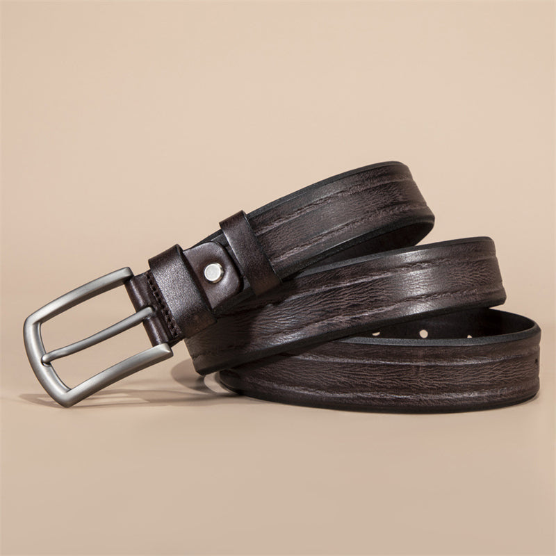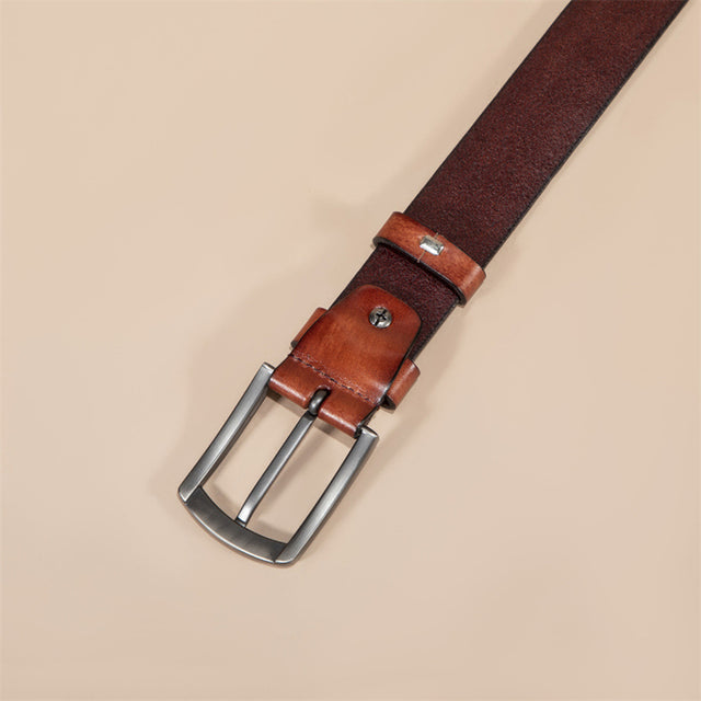 The Veltique Leather Belt is crafted from durable cowskin with a solid pattern, featuring a belt width of 0.8 to 1.6 inches and a thickness of 1.6 inches, complemented by a copper buckle for a sturdy closure.