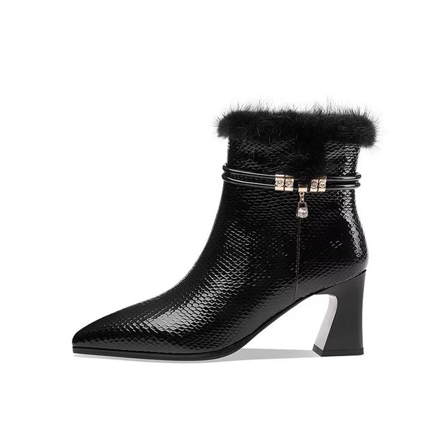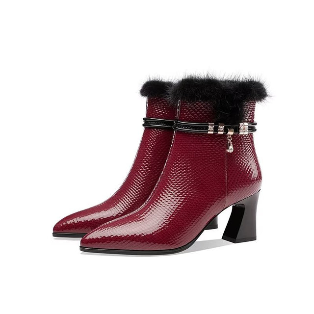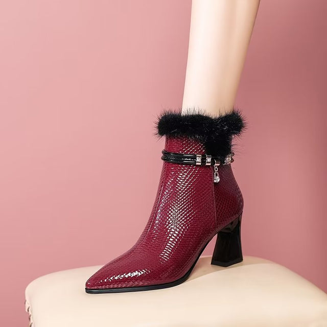 The Opulessa Event Heel Boots are crafted from genuine cow leather with a pointed toe design, featuring a plush-lined interior and a full grain leather insole for added comfort, all in a stylish ankle-height silhouette.