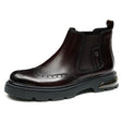 The Eldorian Slip-On Dress Boots feature a solid pattern crafted from genuine leather and first layer cowskin, with an ankle-high design and a convenient slip-on closure. They have a round toe shape and a heel height of approximately 1.3 inches.