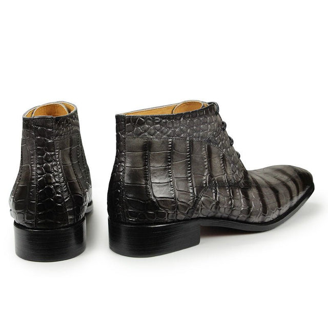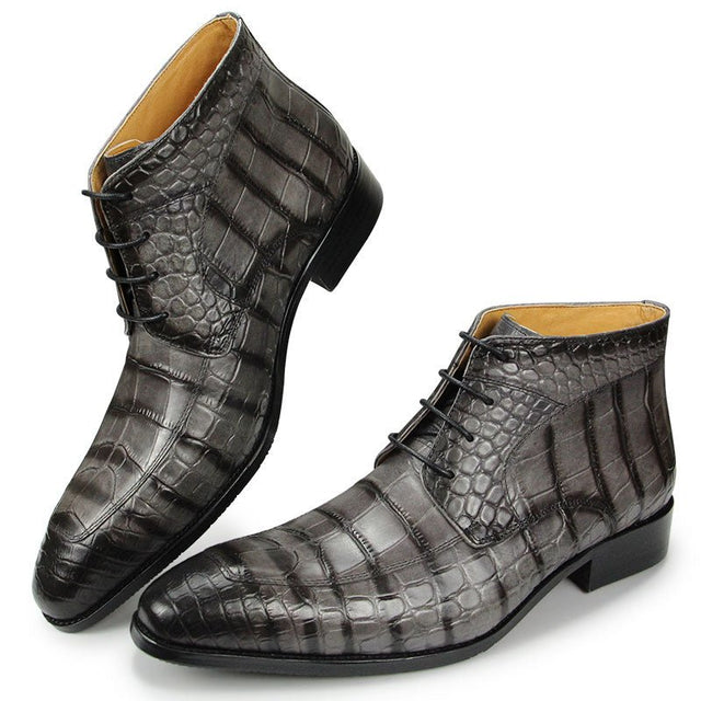 The Croctex Serpatura Dress Boots feature a genuine leather upper with a printed pattern, an ankle-high design, and a lace-up closure. They have a medium heel height ranging from approximately 1.2 to 2 inches and fit true to size.