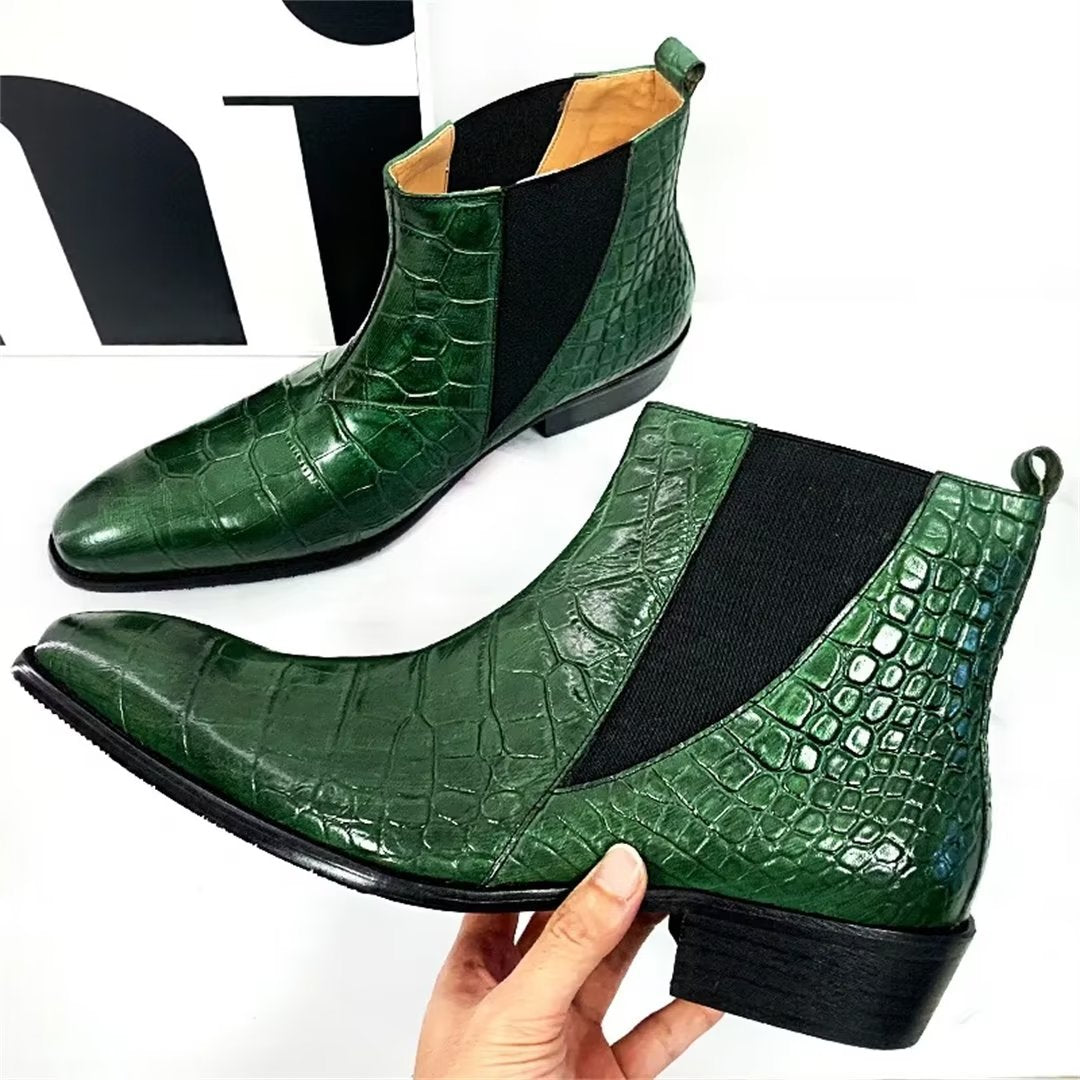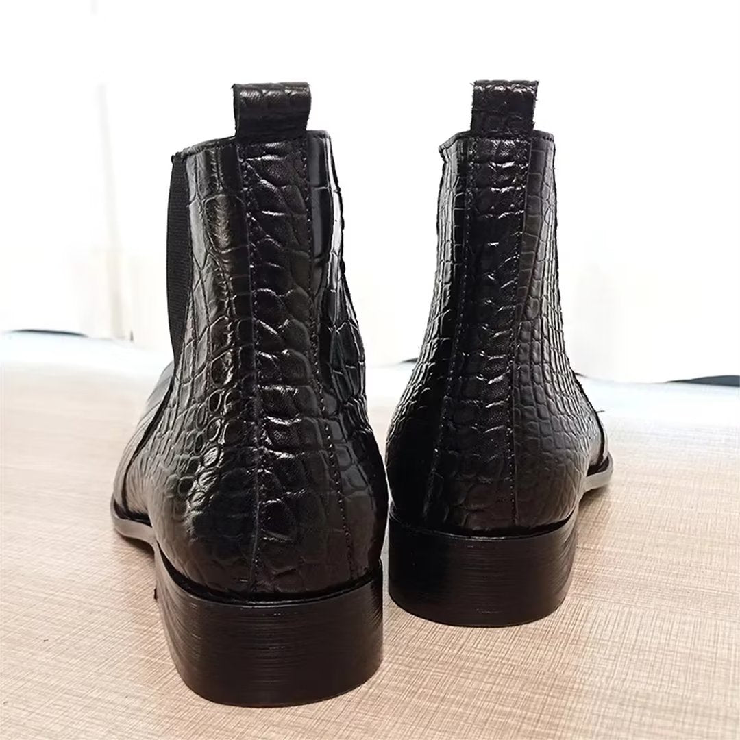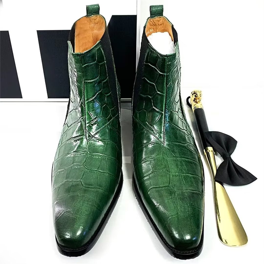 The Serpatura Veltique Dress Boots feature a genuine leather upper with a solid pattern, designed as slip-on ankle boots with a pointed toe, ideal for winter wear.