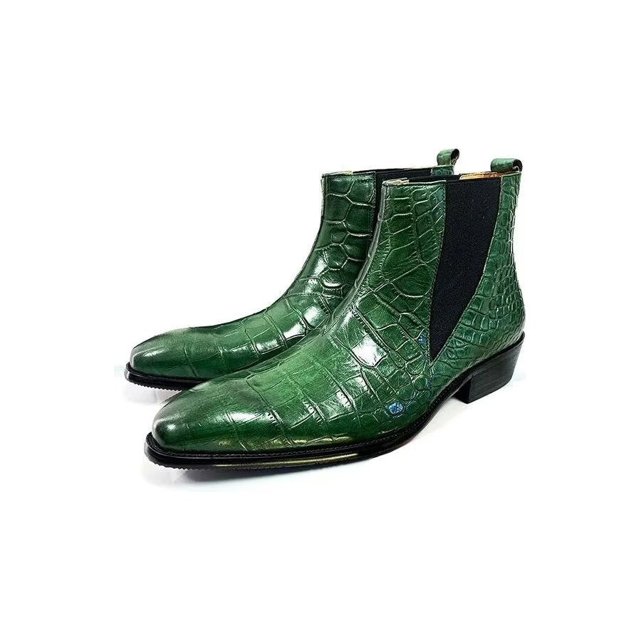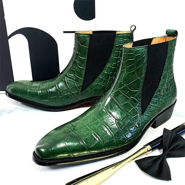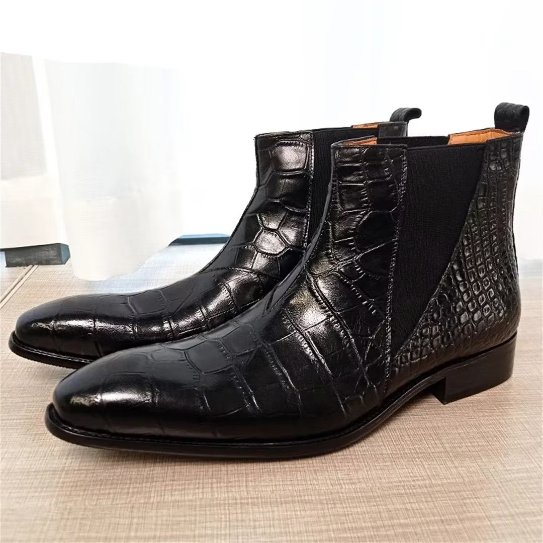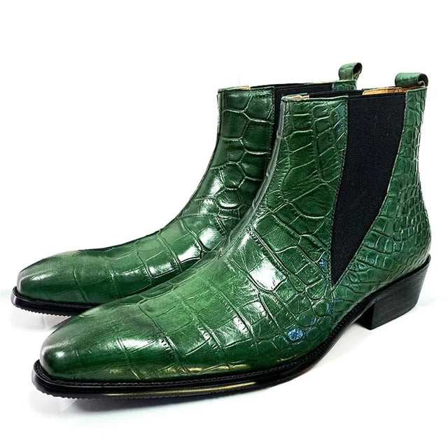 The Serpatura Veltique Dress Boots feature a genuine leather upper with a solid pattern, designed as slip-on ankle boots with a pointed toe, ideal for winter wear.