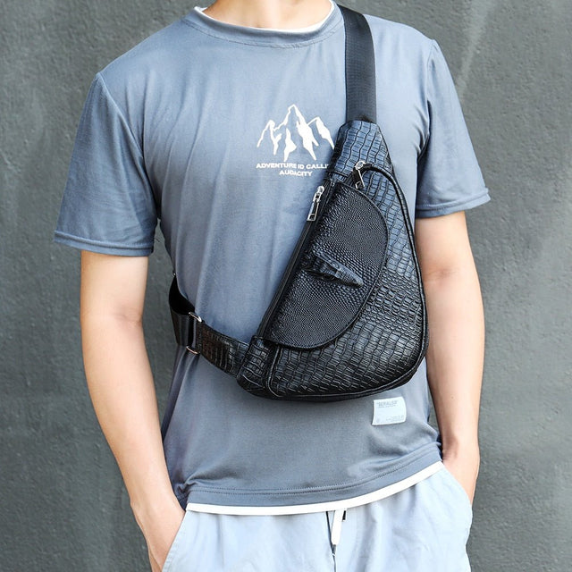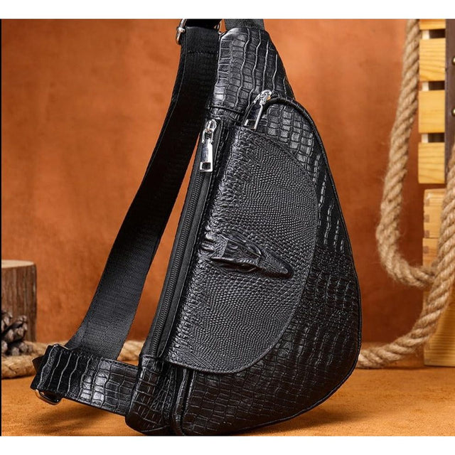 The Luxalon Texture Carryall is a hard saddle-shaped messenger bag crafted from genuine leather with an alligator pattern, featuring a secure zipper closure. Inside, it offers practical organization with a slot pocket, cell phone pocket, zipper pocket, and a key chain holder, all lined with durable polyester.
