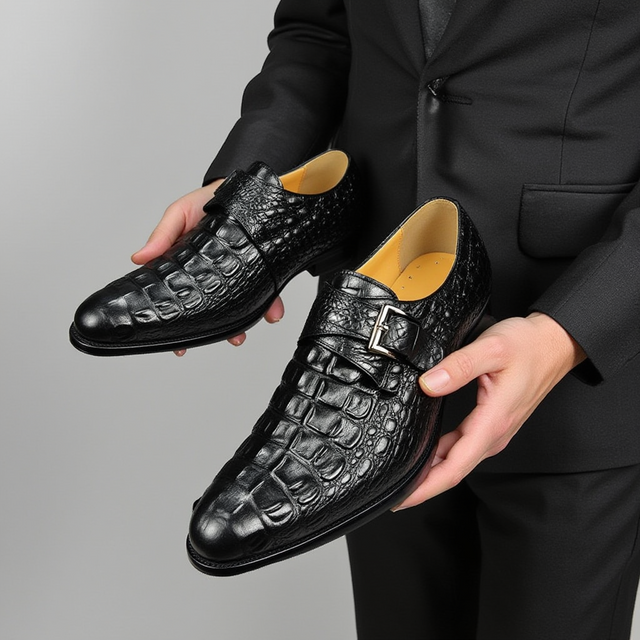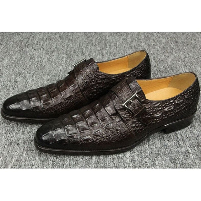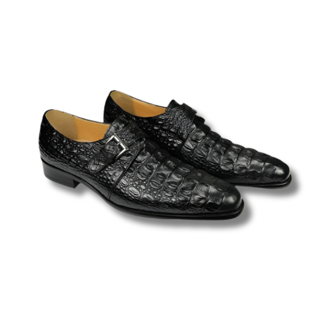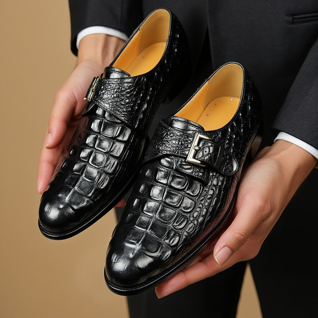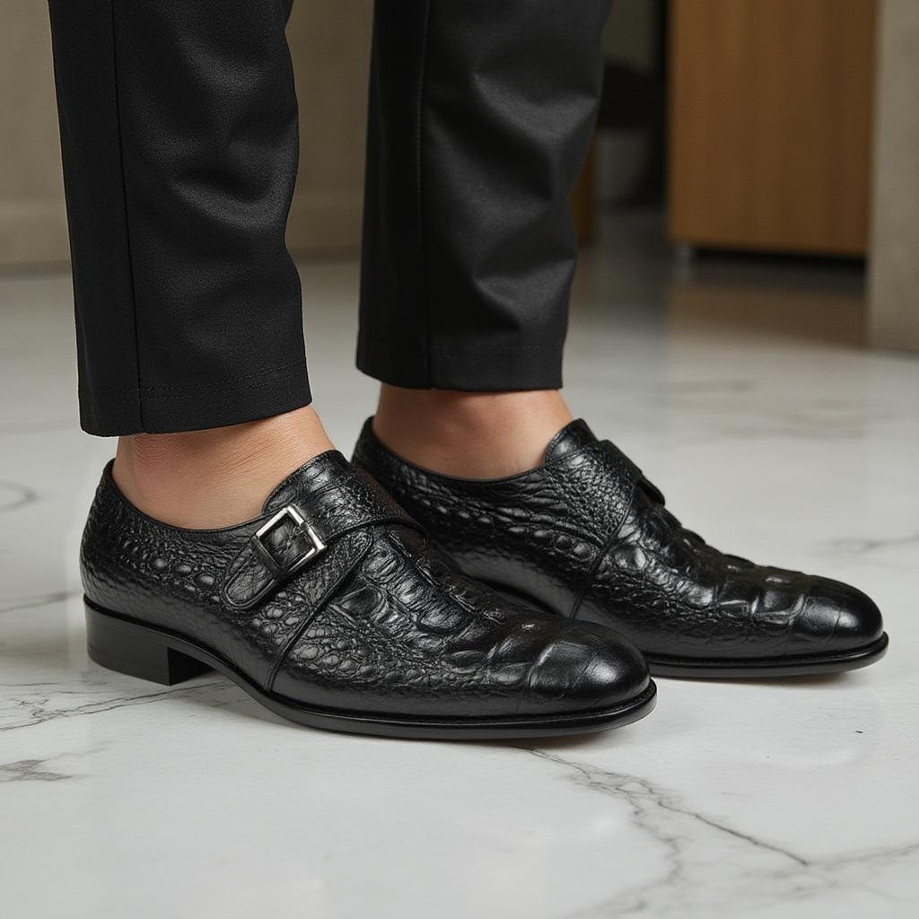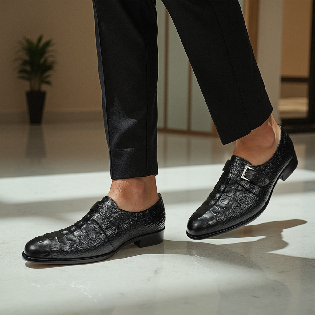 The Veltique Easy Monk Strap Shoes feature a genuine leather upper with a printed pattern, designed as slip-on footwear that offers a height-increasing benefit. They fit true to size, making them ideal for spring and autumn wear.