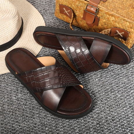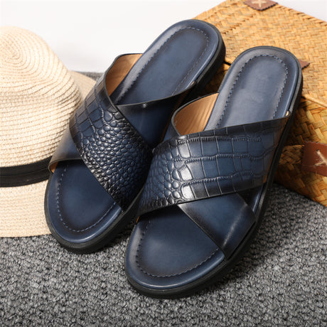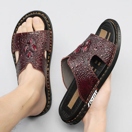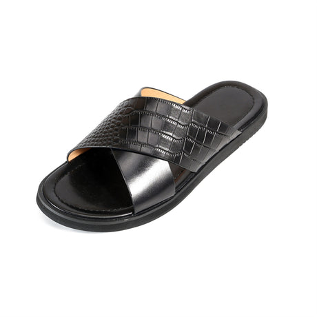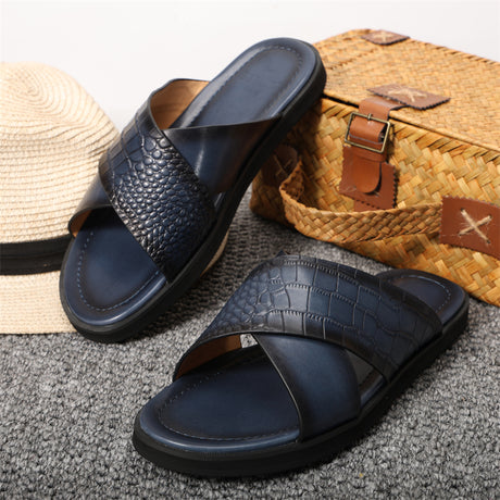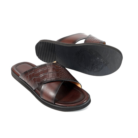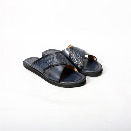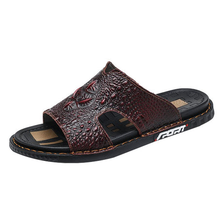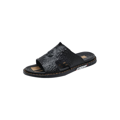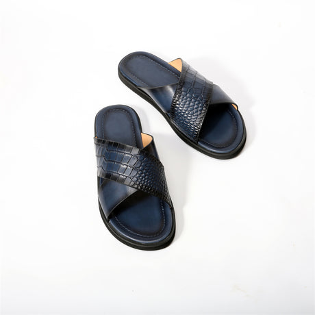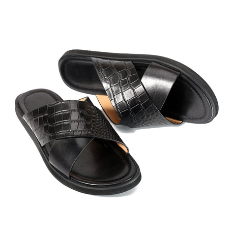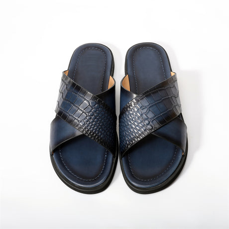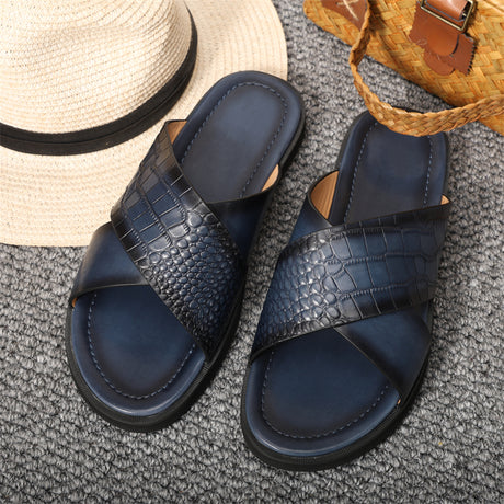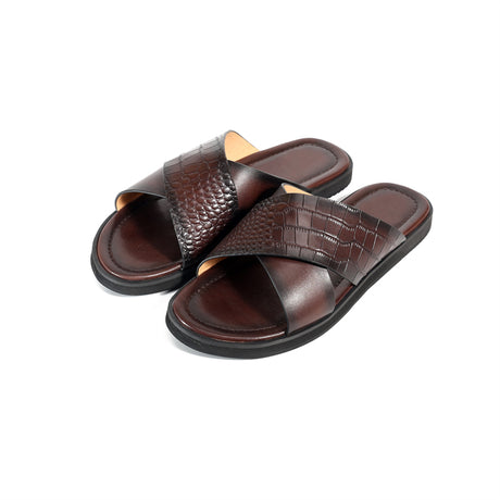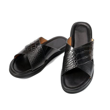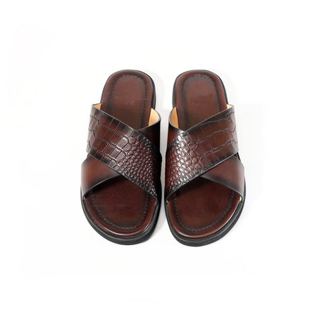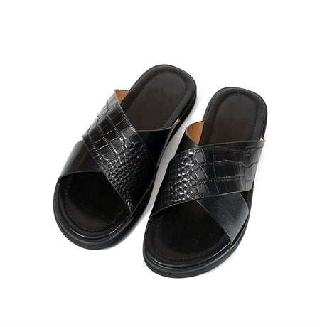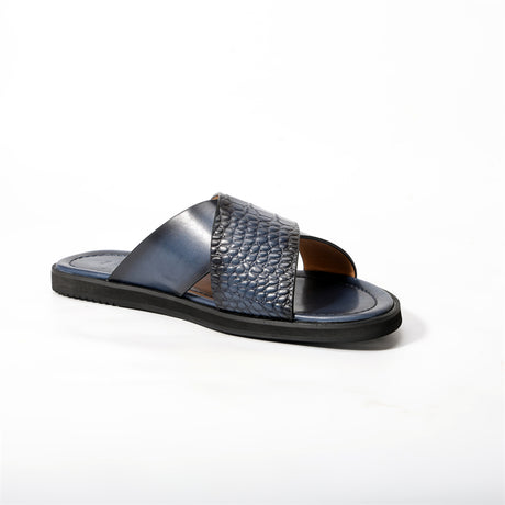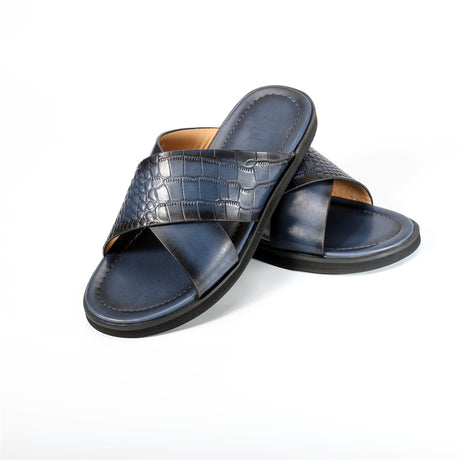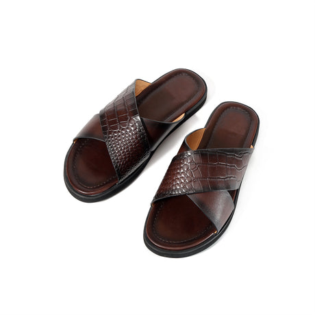 The Opulessa Croctex Slip Sandals feature a genuine leather upper made from first layer cow leather, complemented by a genuine pigskin lining. Designed with a peep toe and a slip-on closure, these sandals have a rubber outsole and a full grain leather insole, with a heel height of approximately 0.8 inches.