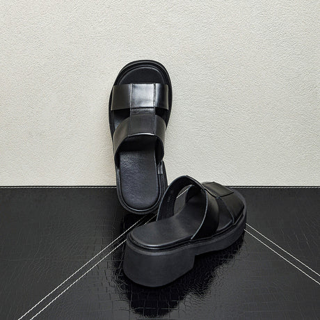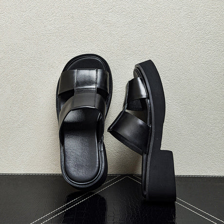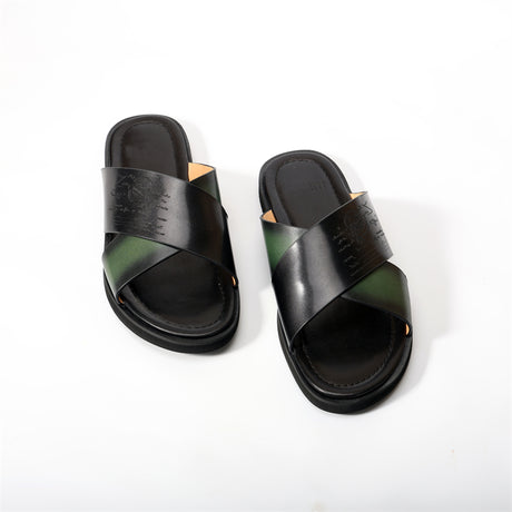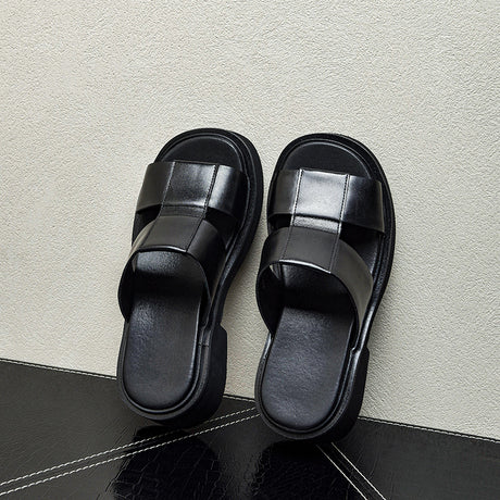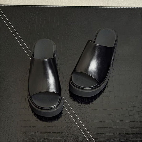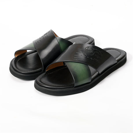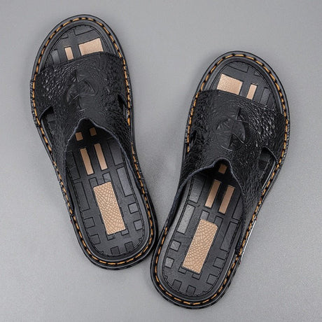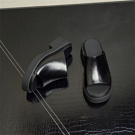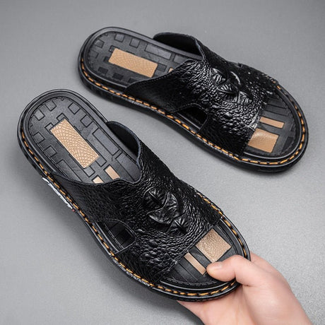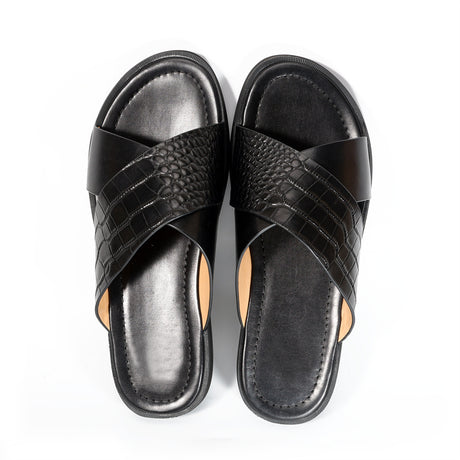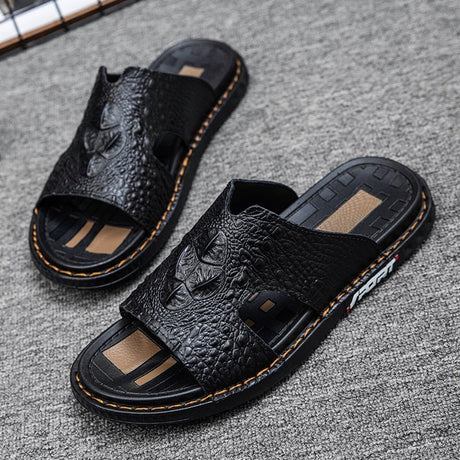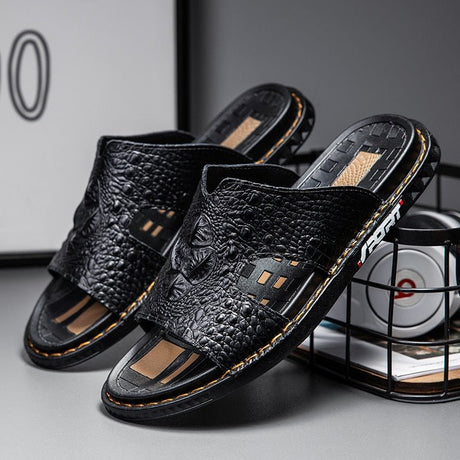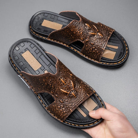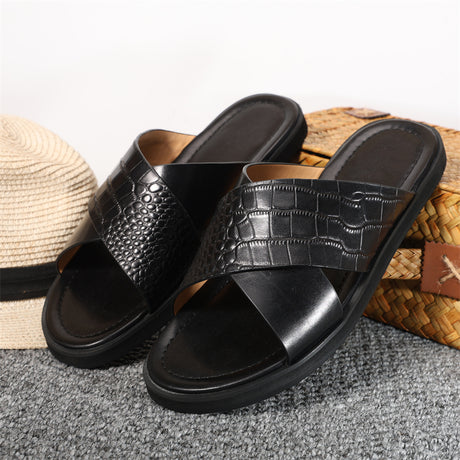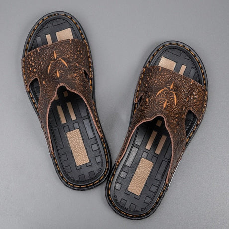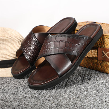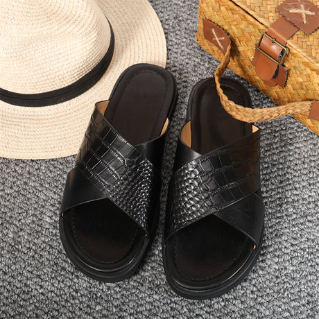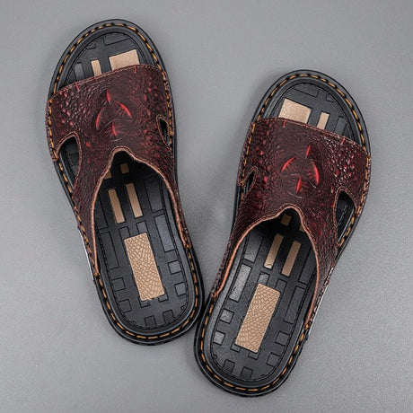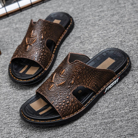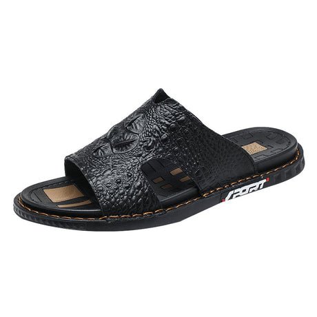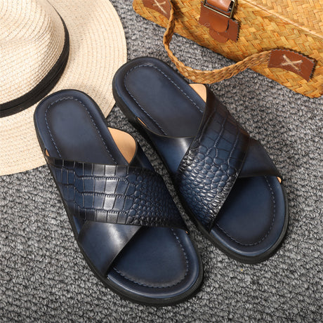 The Opulessa Croctex Slip Sandals feature a genuine leather upper made from first layer cow leather, complemented by a genuine pigskin lining. Designed with a peep toe and a slip-on closure, these sandals have a rubber outsole and a full grain leather insole, with a heel height of approximately 0.8 inches.