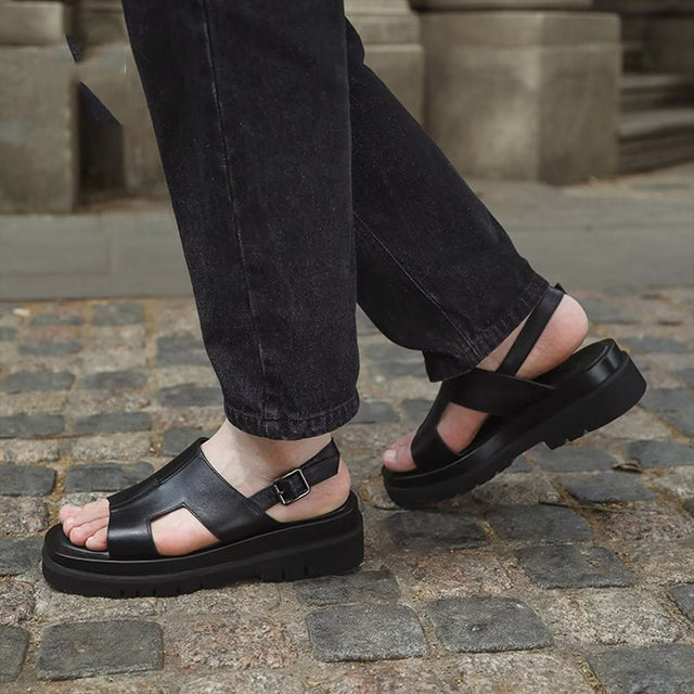 The Ostranuxe Buckle Sandals feature a solid pattern design crafted from genuine first layer cow leather, with a secure buckle closure. The sandals have a durable rubber outsole and a comfortable pigskin insole and lining, complemented by a stylish platform element.
