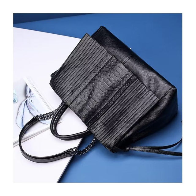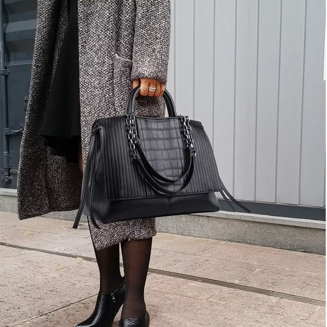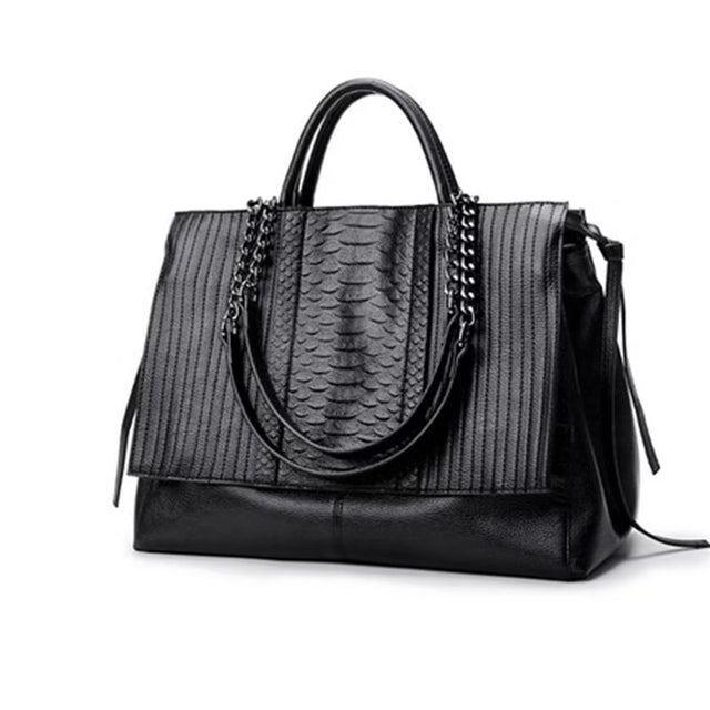 The Serpatura Business Carryall is crafted from genuine cow leather, featuring a solid pattern and a secure zipper closure. It includes an interior slot pocket for organization and an exterior flap pocket for easy access to essentials.