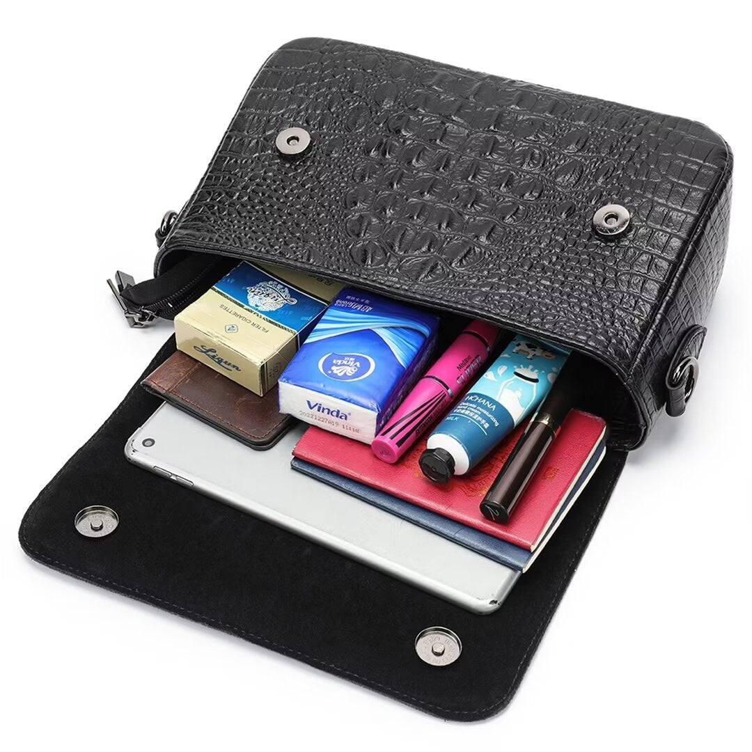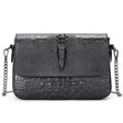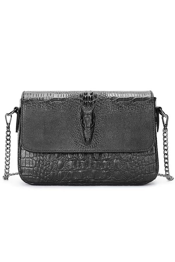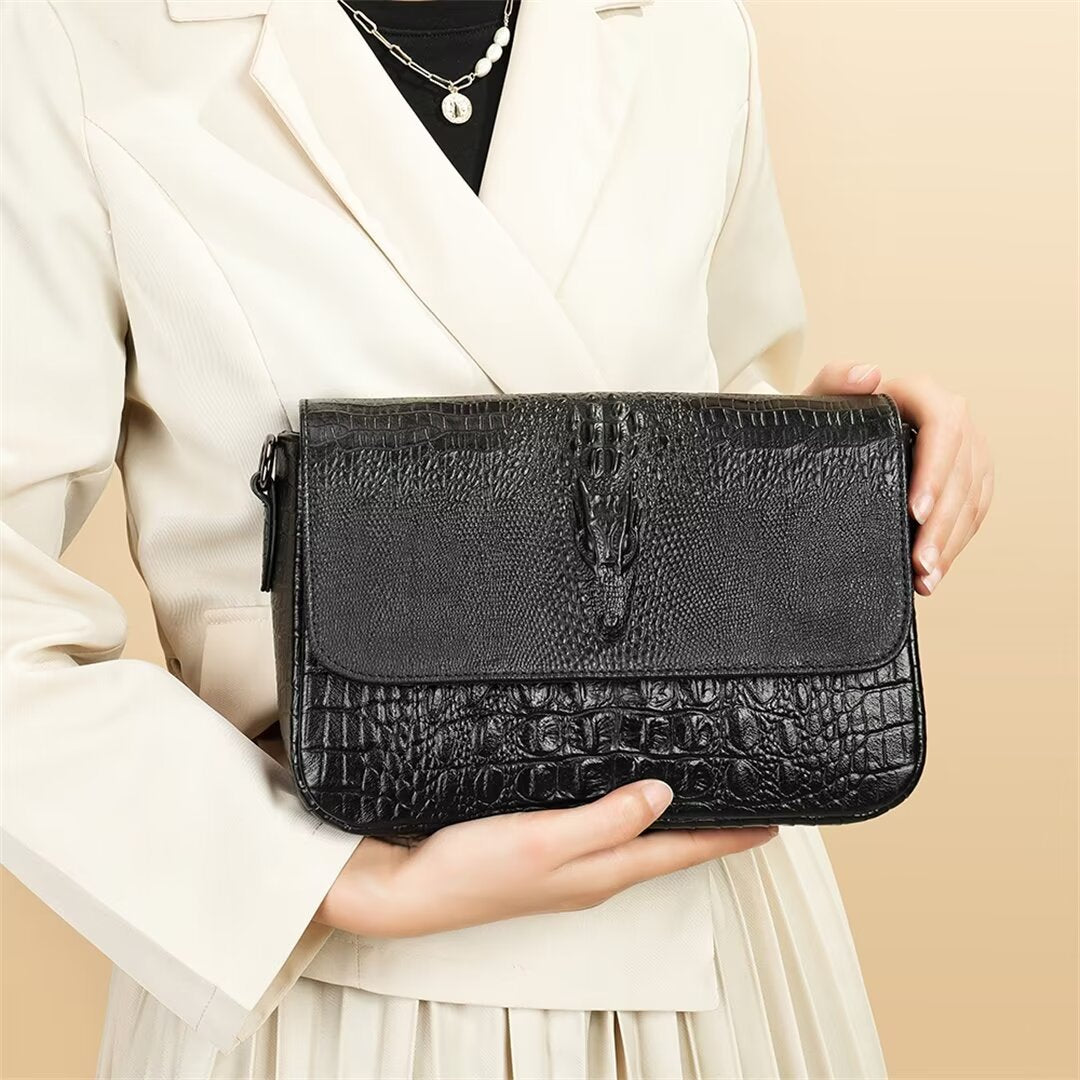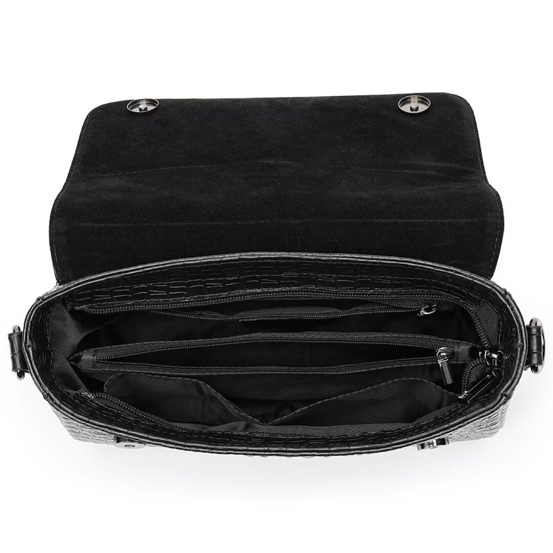 The Opulessa Chromura Event Bag is a crossbody bag crafted from cow leather with an alligator pattern, featuring a secure zipper closure. Its casual tote shape includes practical interior features such as a slot pocket, cell phone pocket, zipper pocket, key chain holder, and a compartment for organized storage.