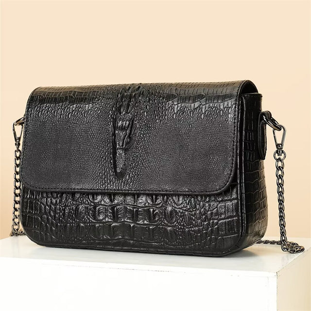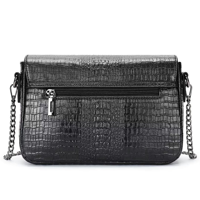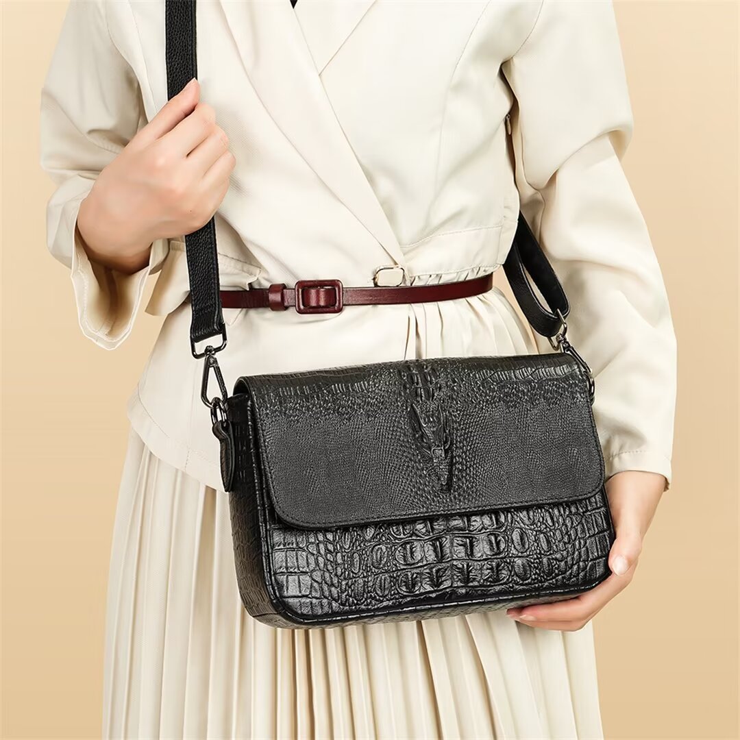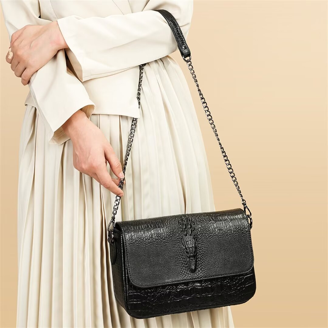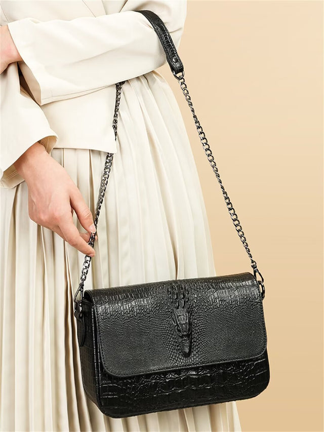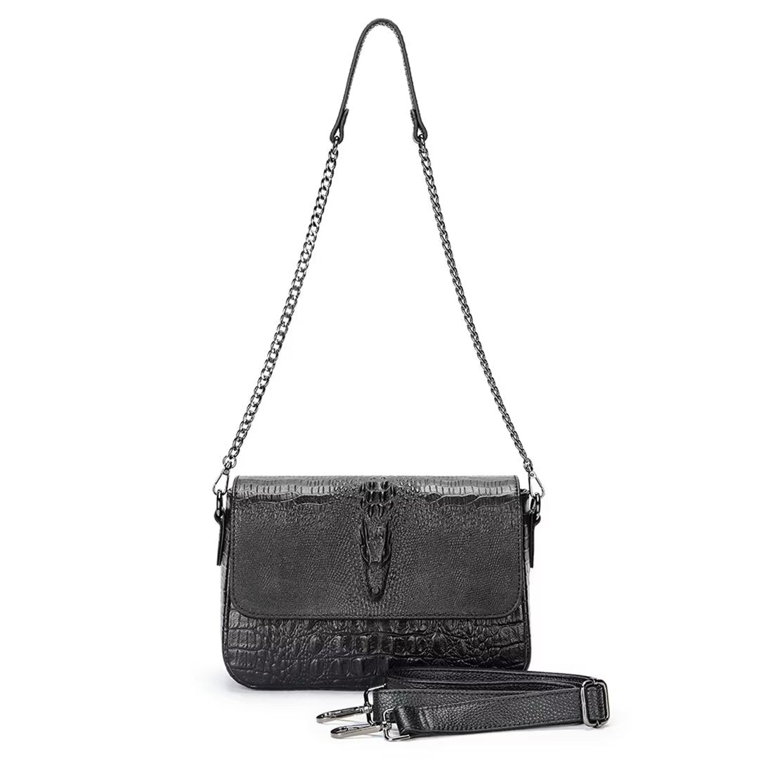 The Opulessa Chromura Event Bag is a crossbody bag crafted from cow leather with an alligator pattern, featuring a secure zipper closure. Its casual tote shape includes practical interior features such as a slot pocket, cell phone pocket, zipper pocket, key chain holder, and a compartment for organized storage.