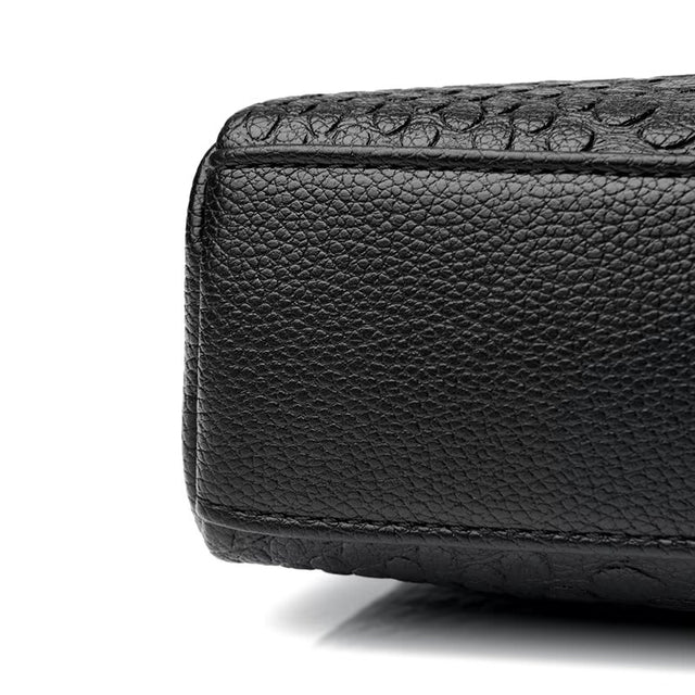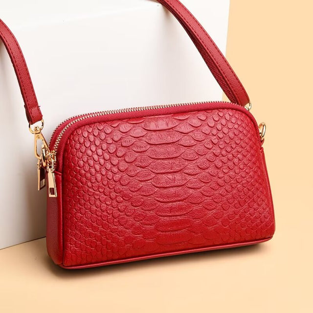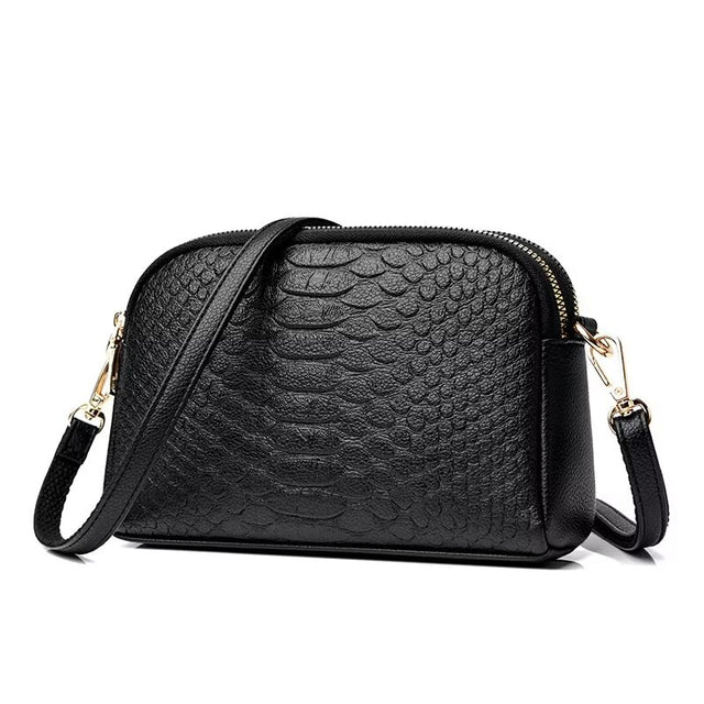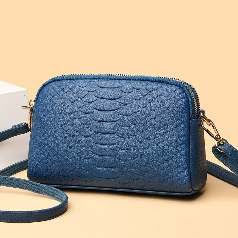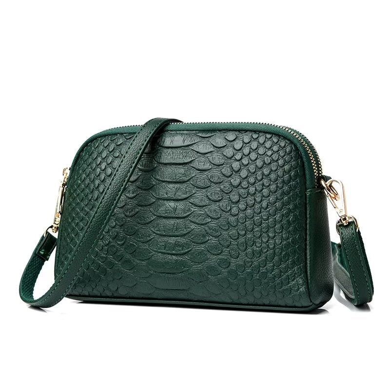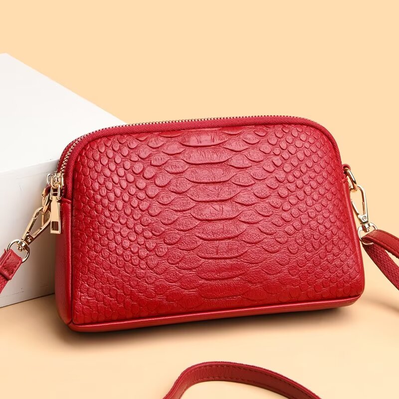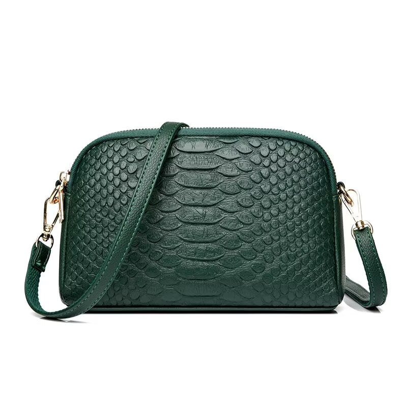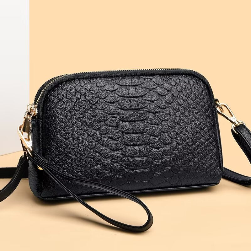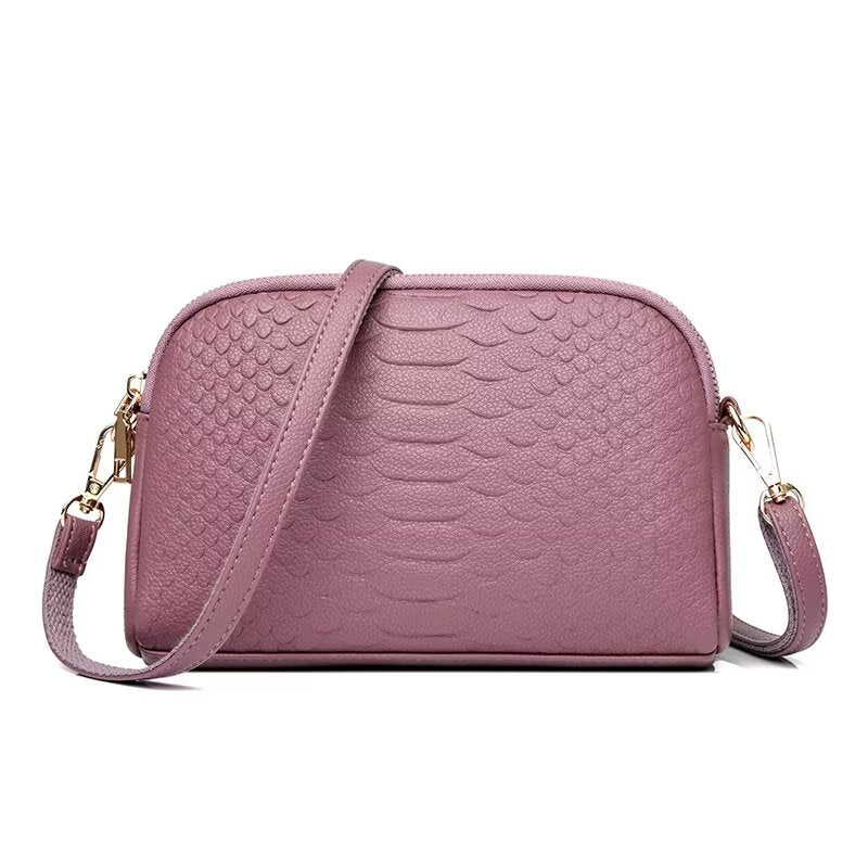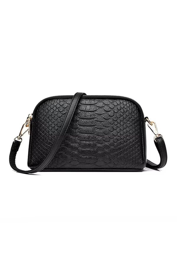The Veltique Luxe Crossbody Elegance is crafted from durable PU material with an alligator pattern, featuring a secure zipper closure. Its interior is thoughtfully designed with a slot pocket, cell phone pocket, zipper pocket, key chain holder, and compartment, all within a hard, casual tote shape.