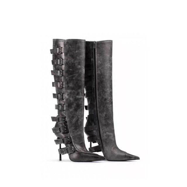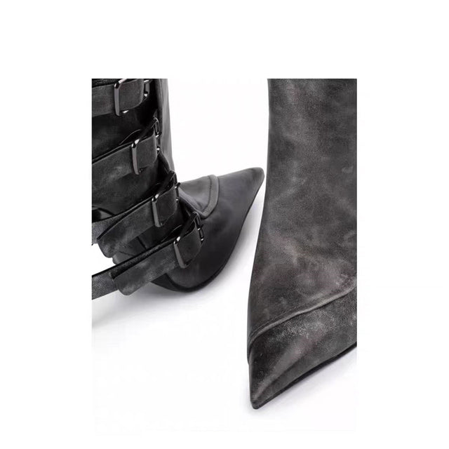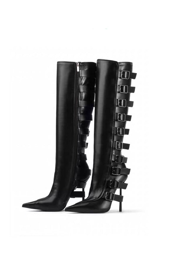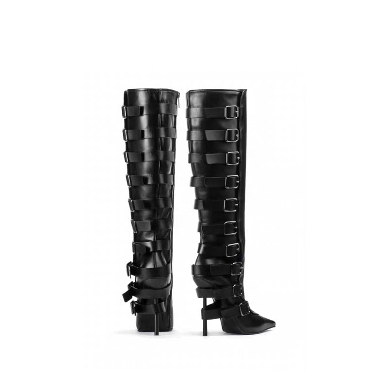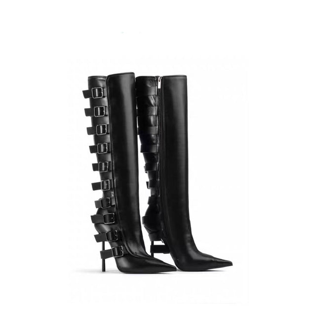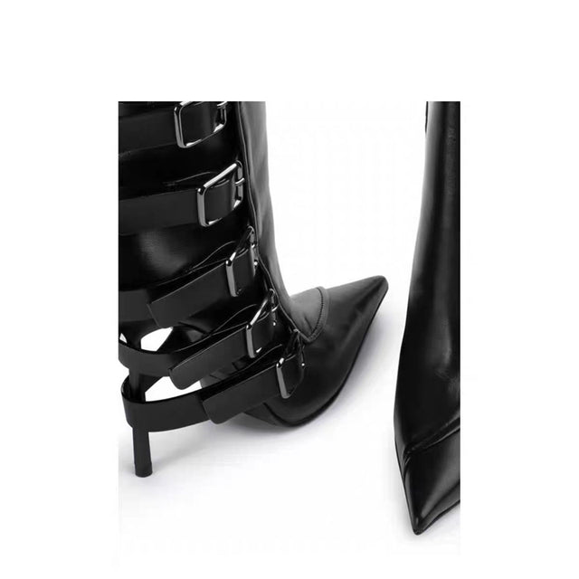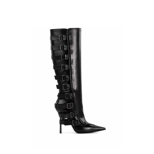 The Ebonique Veltique Gala Boots are designed for winter with a long boot height and a pointed toe shape, featuring a durable rubber outsole for reliable traction.