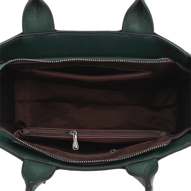 The Veltique Iconic Carryall Tote is crafted from durable PU material with an alligator pattern, featuring a secure zipper closure. Its hard structure provides stability, while the interior is equipped with a slot pocket, cell phone pocket, zipper pocket, key chain holder, and compartment for organized storage.