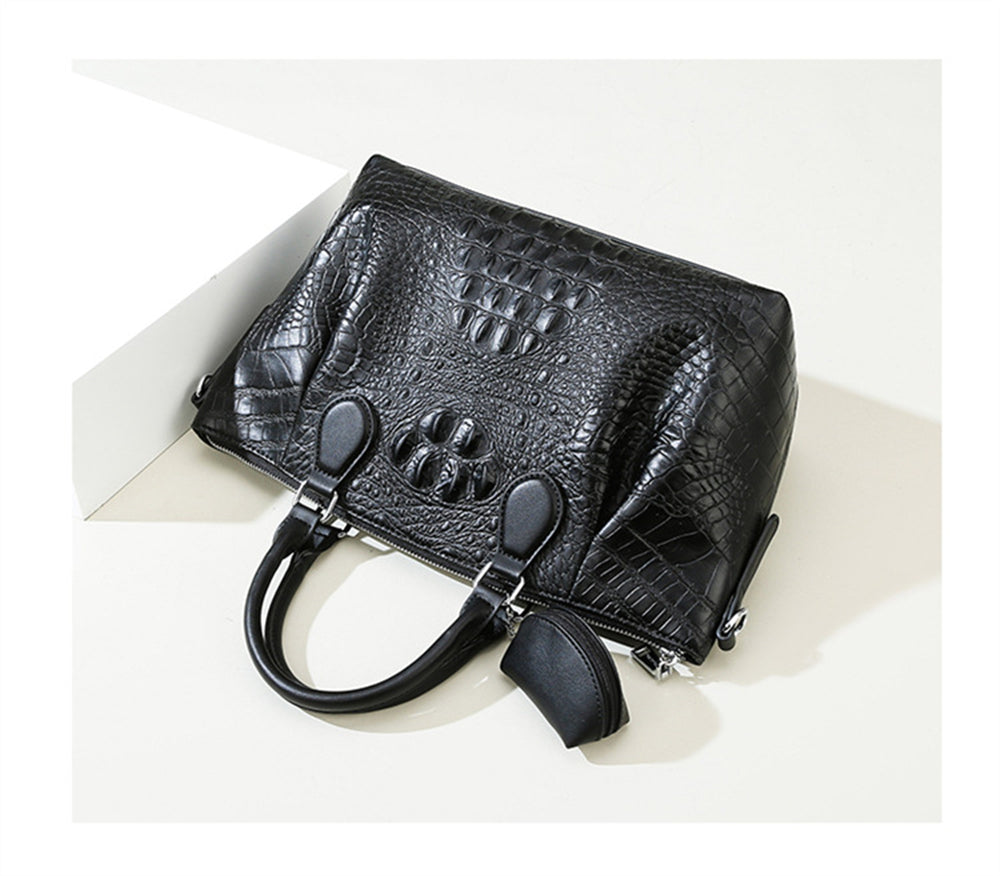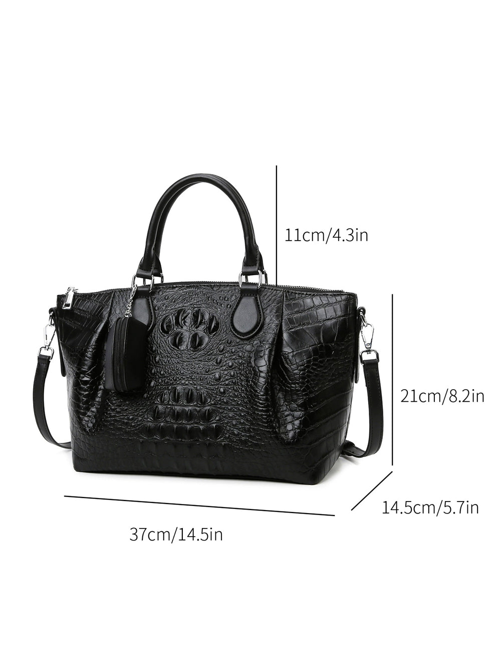 The Opulessa Chromura Office Tote is crafted from durable PU material with an alligator pattern and features a secure zipper closure. Its interior is thoughtfully designed with a slot pocket, cell phone pocket, zipper pocket, key chain holder, and compartment, providing organized storage for daily essentials.