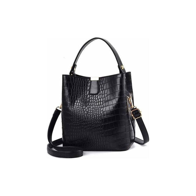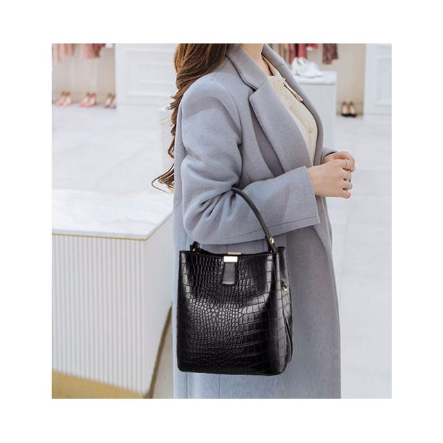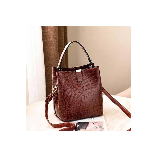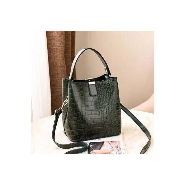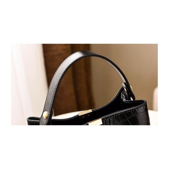 The Veltique Exotic Office Tote is crafted from durable PU material, featuring an alligator pattern and secured with a hasp closure, making it a stylish and functional choice for office use.