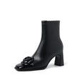 The Serpatura Luxalon Bootie Glam features genuine cow leather for the main material, a short plush insole for comfort, and a high square heel ranging from 2 to 3 inches. Designed with a square toe, these ankle-height boots combine style and functionality.