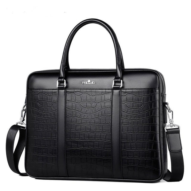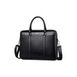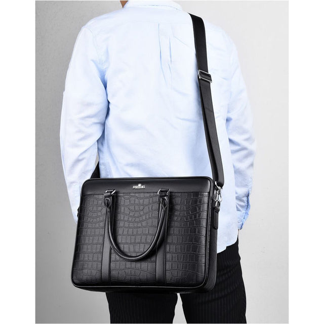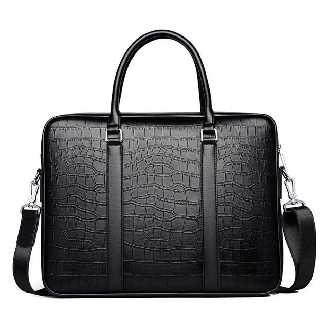 The Serpatura Office Executive Brief is crafted from durable microfiber synthetic leather with a distinctive crocodile pattern, featuring a secure zipper closure. It measures 11.4 inches in height and is designed to accommodate a 14-inch laptop, making it ideal for business use.