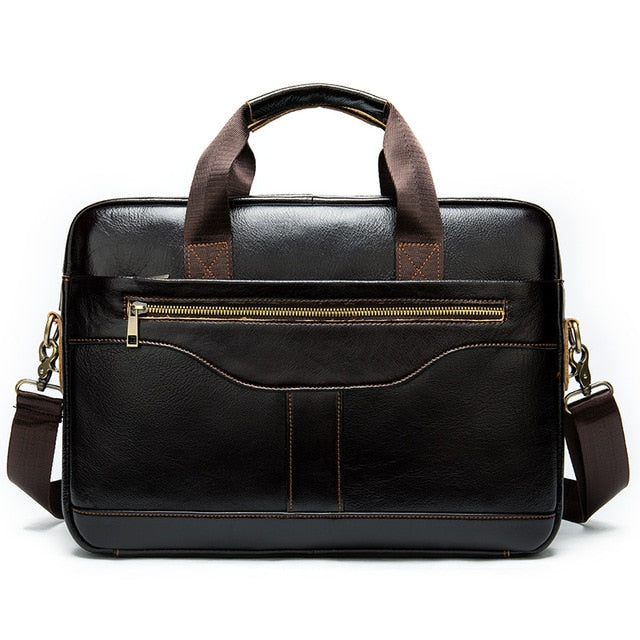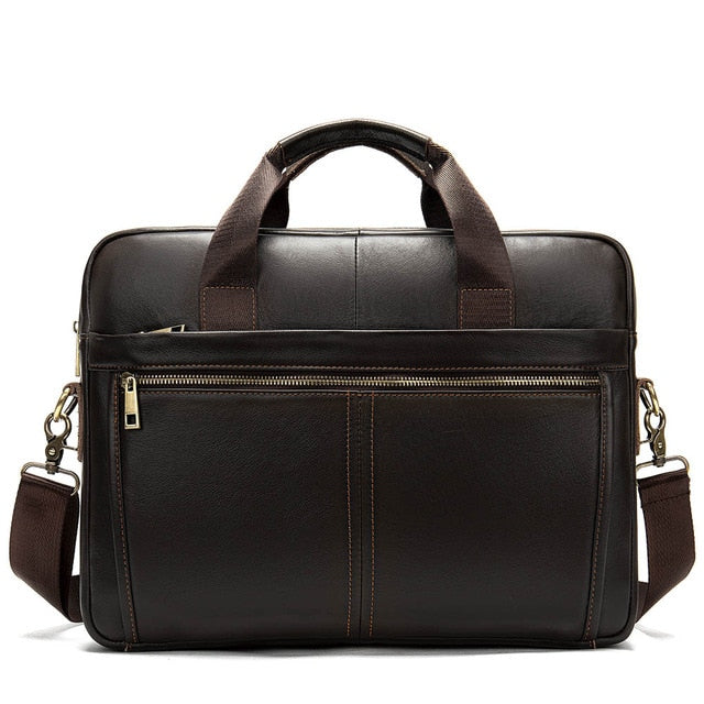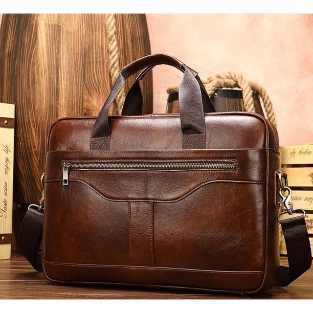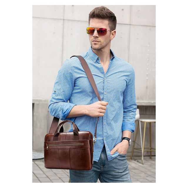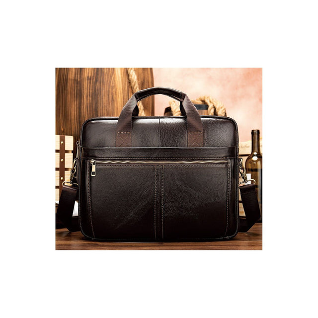 The Ostranuxe Luxe Briefcase is crafted from genuine cow leather with a solid pattern, featuring a secure zipper closure. It measures 15.2 inches in height and 10.8 inches in length, designed to accommodate a 14-inch size.