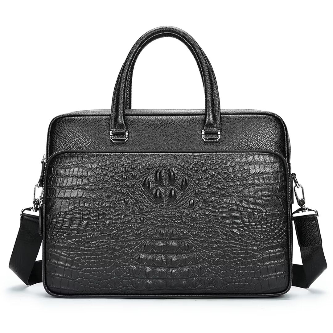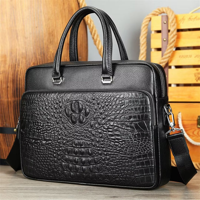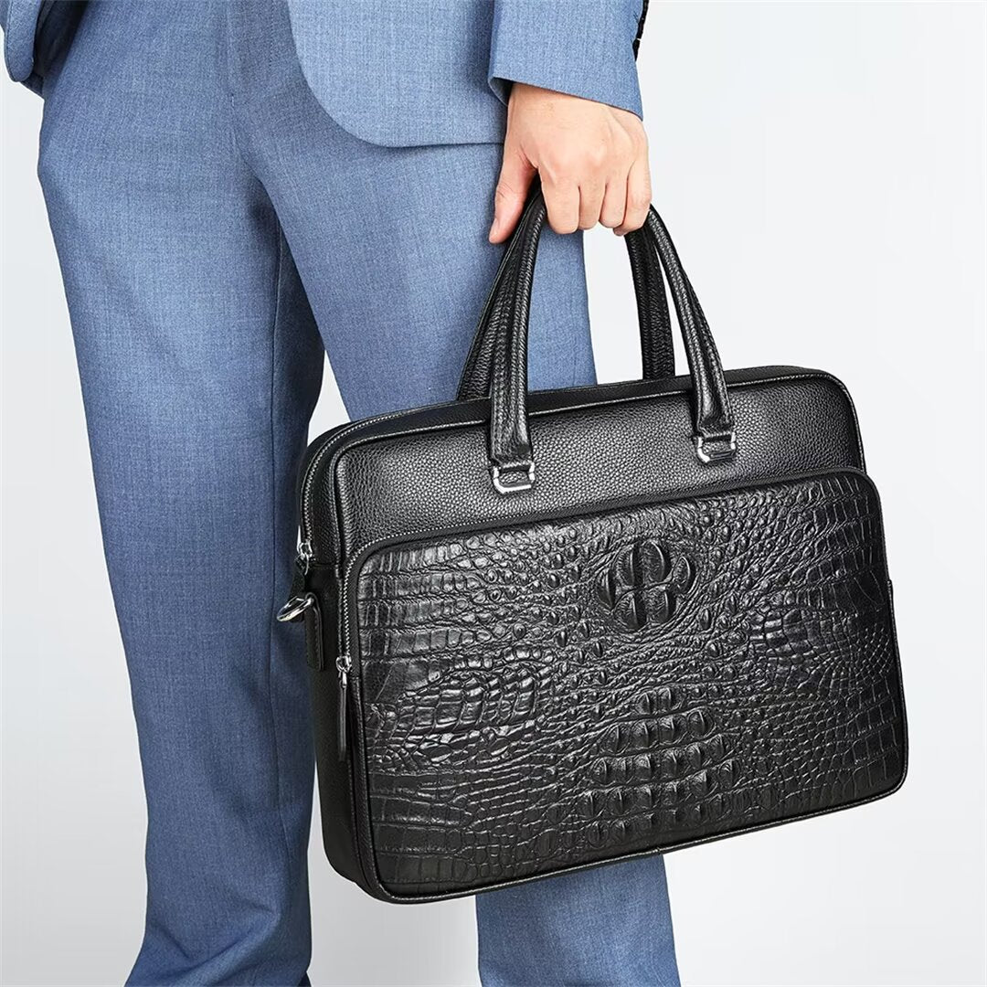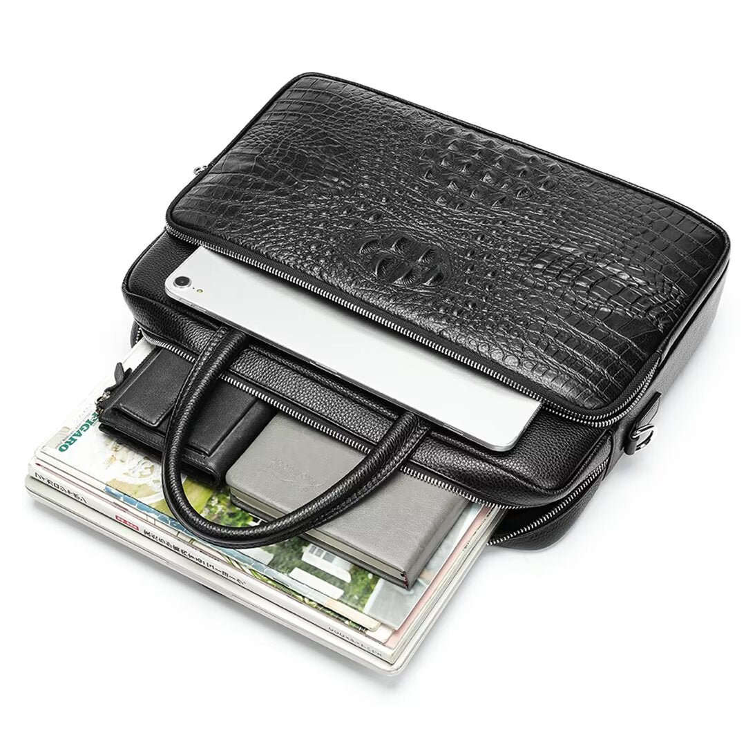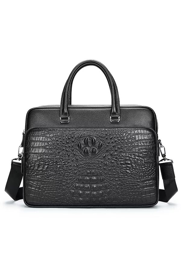 The Veltique Business Croc Briefcase is crafted from durable cow leather with an alligator pattern, featuring a secure zipper closure. Its interior is designed for organization, offering a slot pocket, cell phone pocket, zipper pocket, key chain holder, and compartment, all within a hard, casual tote shape.