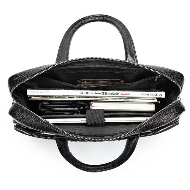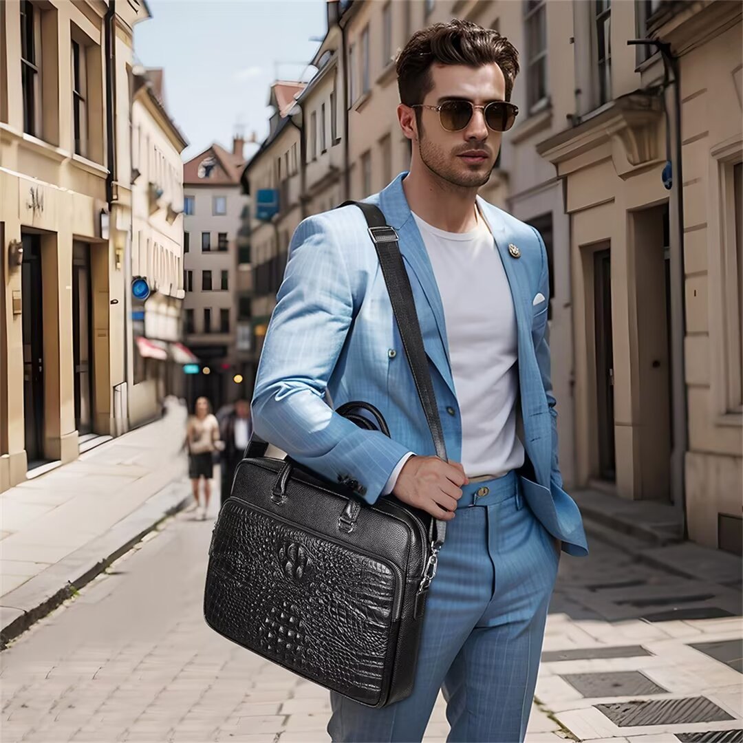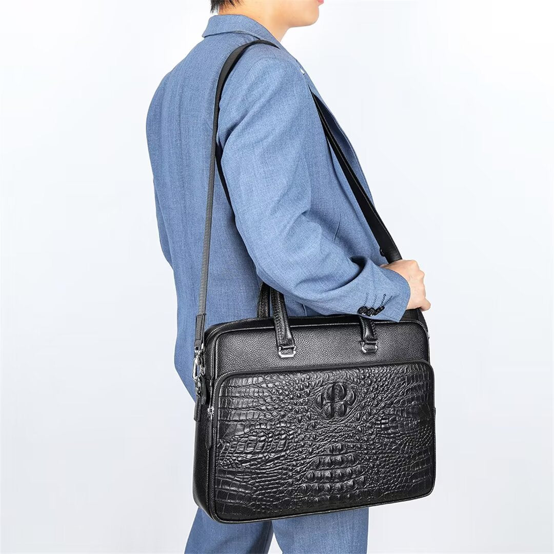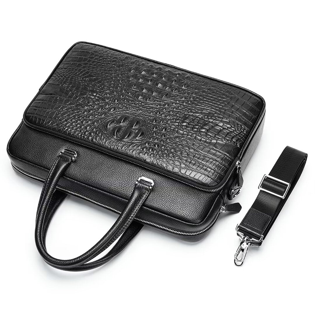 The Veltique Business Croc Briefcase is crafted from durable cow leather with an alligator pattern, featuring a secure zipper closure. Its interior is designed for organization, offering a slot pocket, cell phone pocket, zipper pocket, key chain holder, and compartment, all within a hard, casual tote shape.