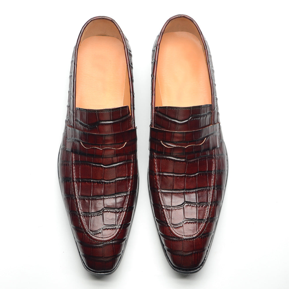 The Diamoré Ebonique Croc Brogues feature a solid pattern with an upper and lining made from genuine cow leather, a full grain leather insole, and a durable rubber outsole. Designed with a round toe and a convenient slip-on closure, these brogues offer both style and comfort.