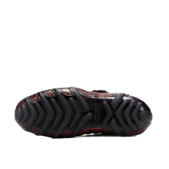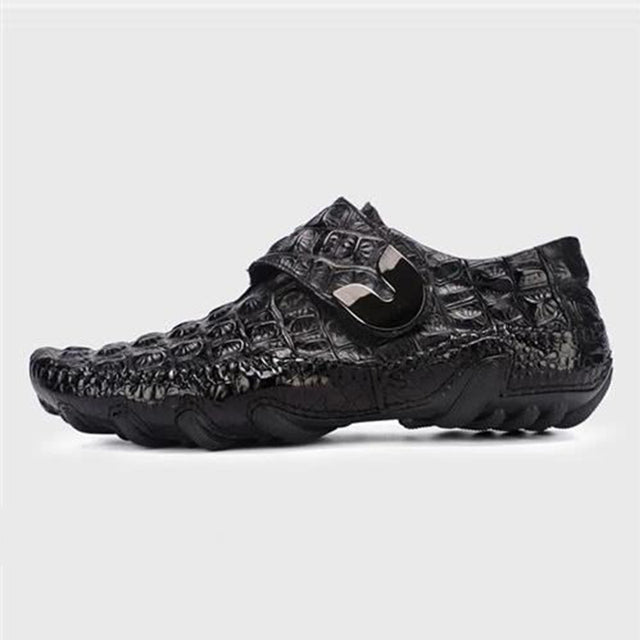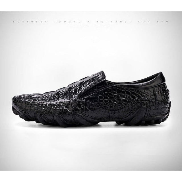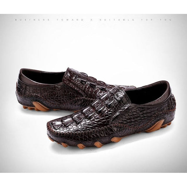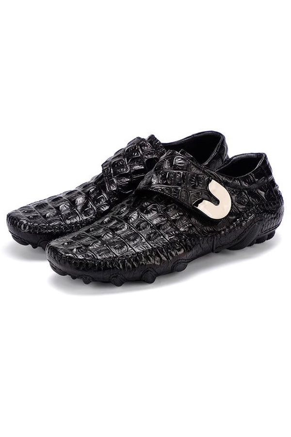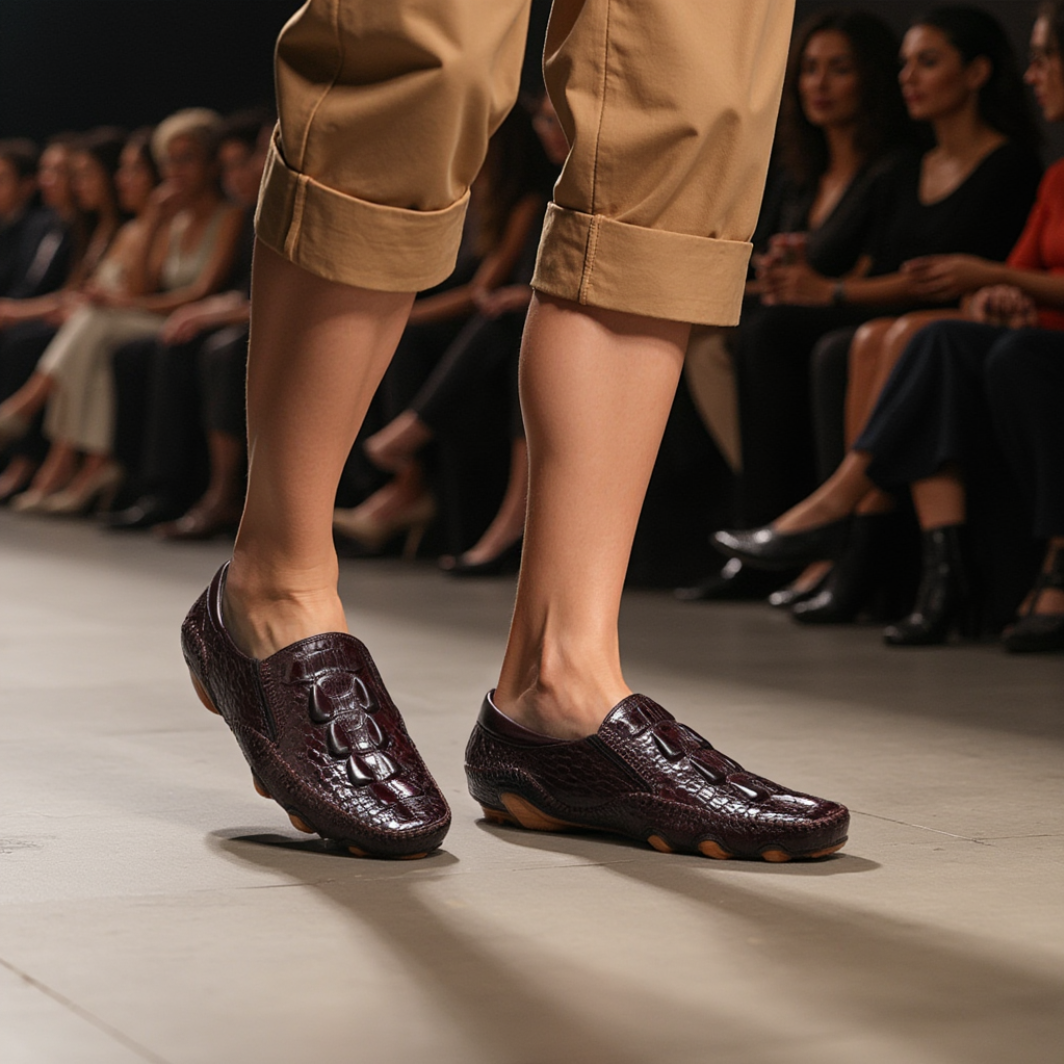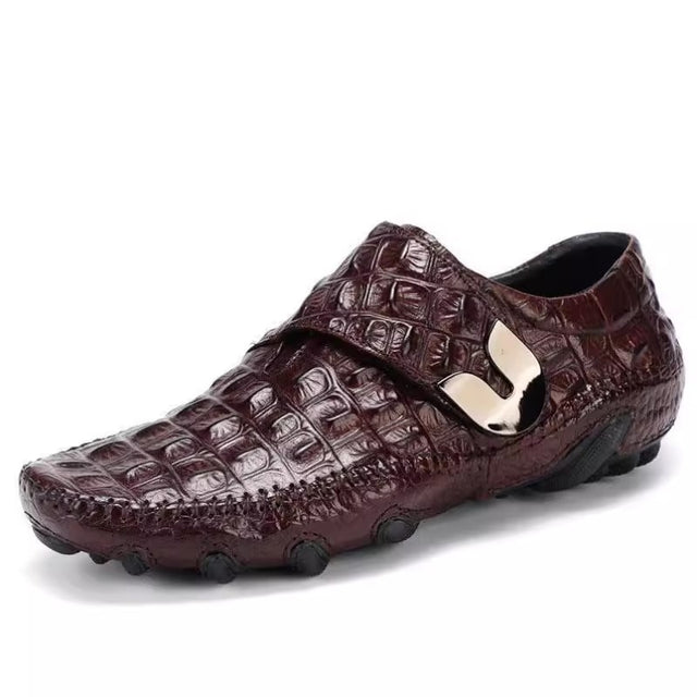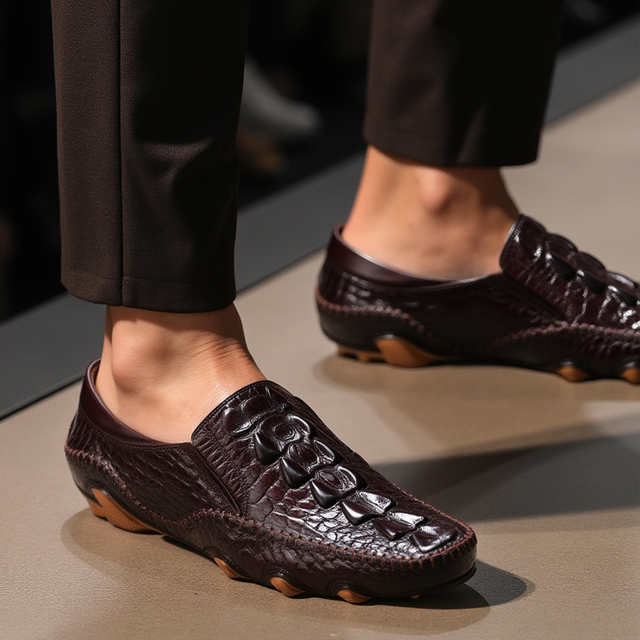 The Opulessa Croc Pattern Slip-ons are crafted from high-quality genuine leather, featuring a trendy alligator design. They include a rubber insole for added support and a genuine leather lining to keep feet cool and dry, combining comfort with style.