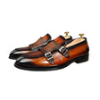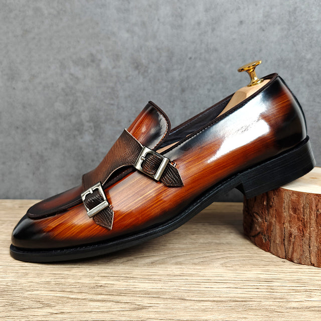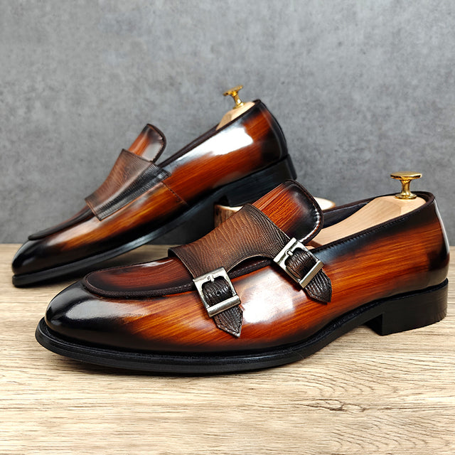 The Serpatura Double Monk Elegance features a solid pattern crafted from premium cow leather, with a pointed toe design and a secure buckle strap closure, complemented by a durable rubber outsole.