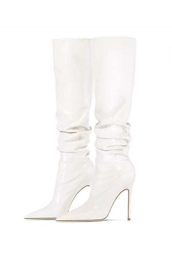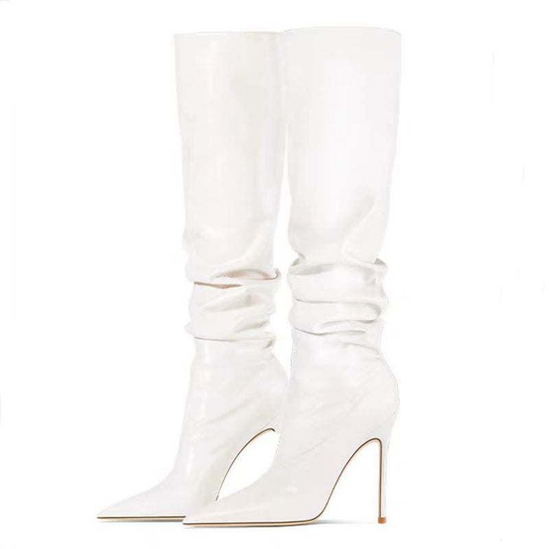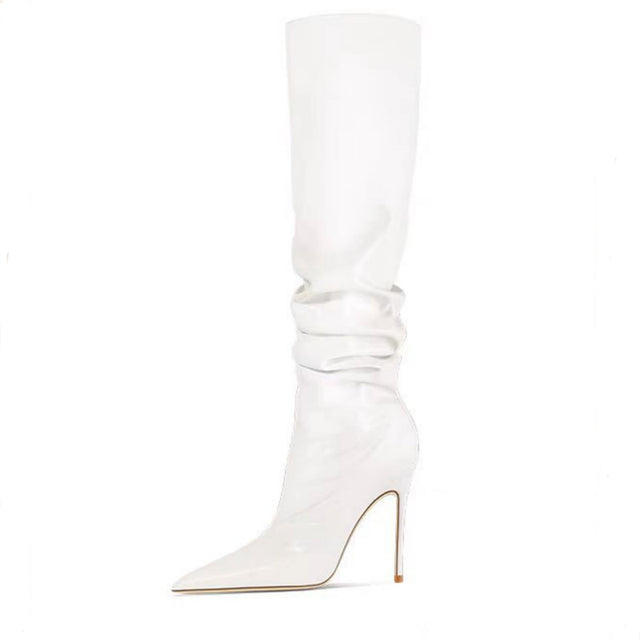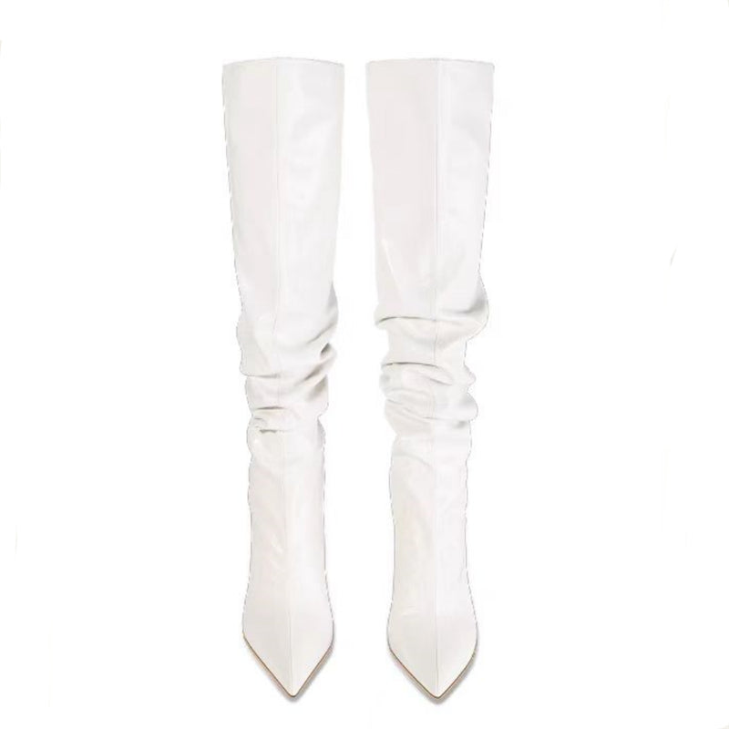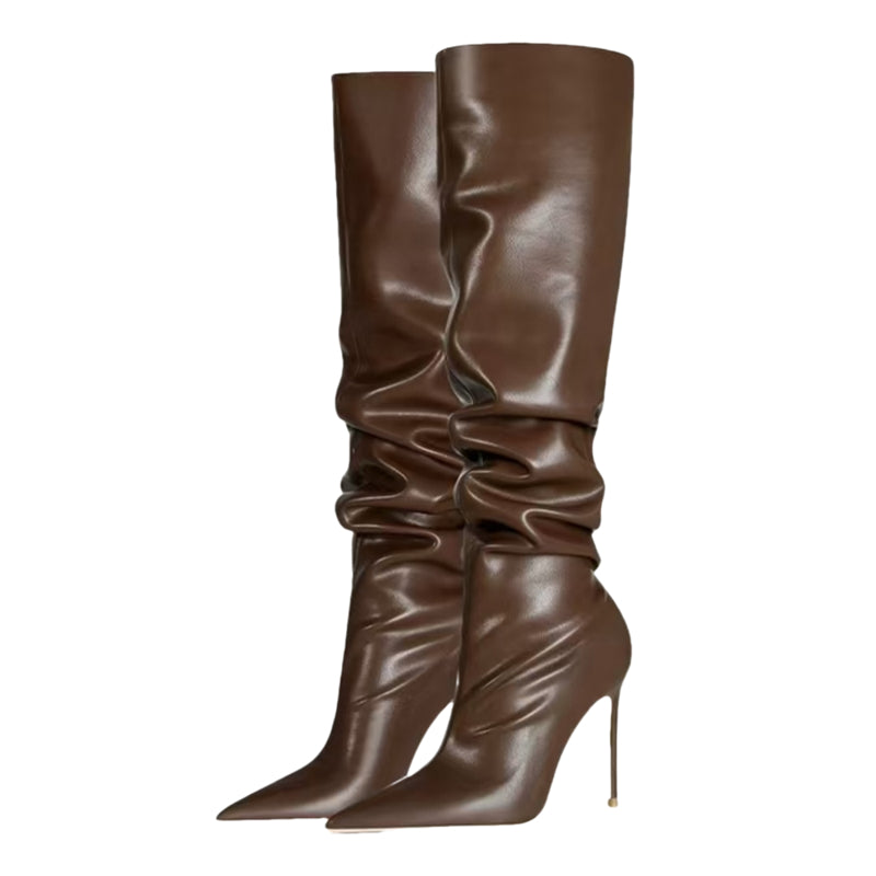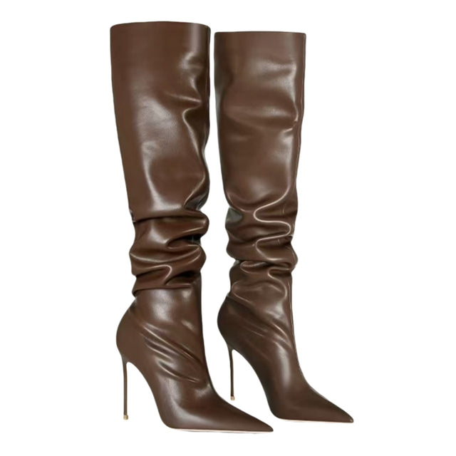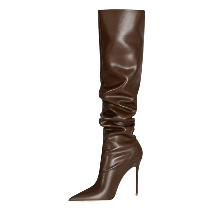 The Exoticade Luxalon Prestige Knee Highs are tall winter boots crafted from solid leather, featuring a pointed toe design and a durable rubber outsole. They have a convenient zipper closure for easy wear.