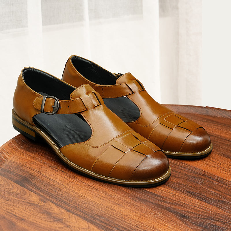 The Celestova Chic Buckle Leather Sandals feature a genuine leather upper made from first layer cow leather, a first layer pigskin lining, and a full grain leather insole, all designed for comfort and durability. These sandals have a round toe shape, a secure buckle closure, and a rubber outsole for reliable traction.