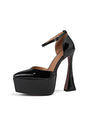 The Celestova Ostranuxe Event Croctex Platform Heels feature a genuine cow leather upper with a pigskin lining, a super high heel over 5.9 inches, and a platform height up to 2.16 inches. These solid-patterned heels have a buckle strap closure and are adorned with crystal elements, offering a sexy style.