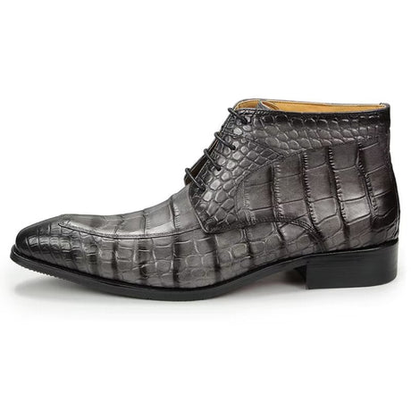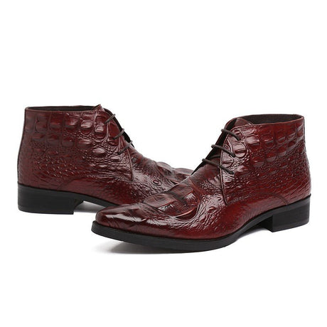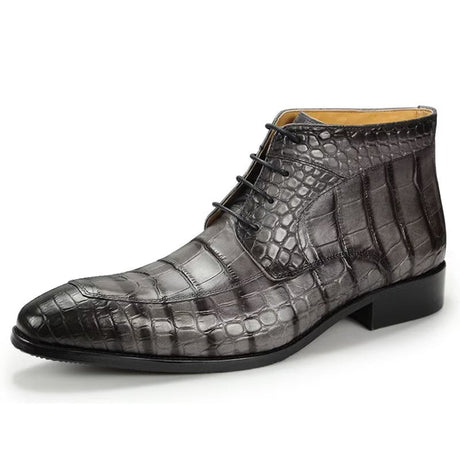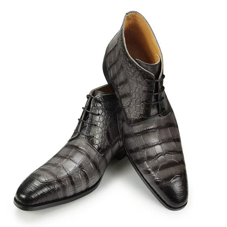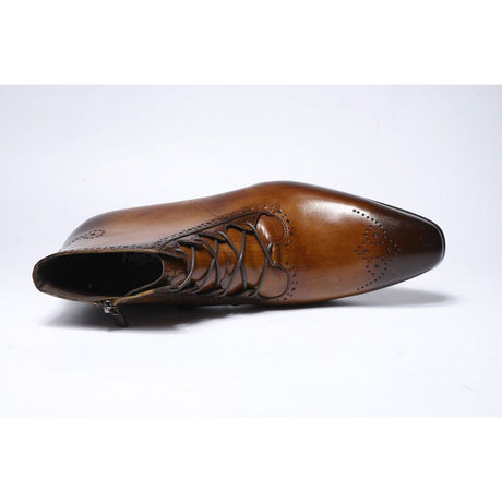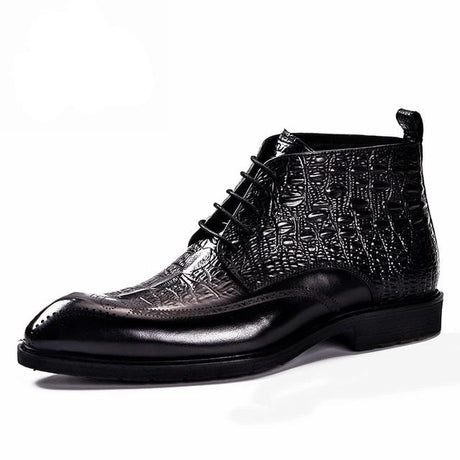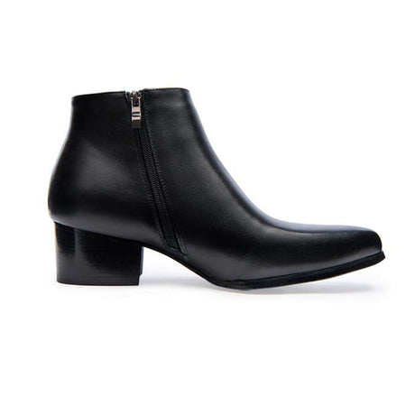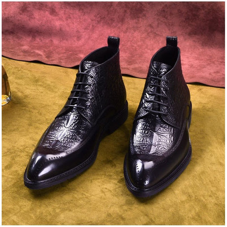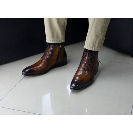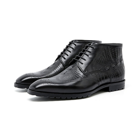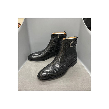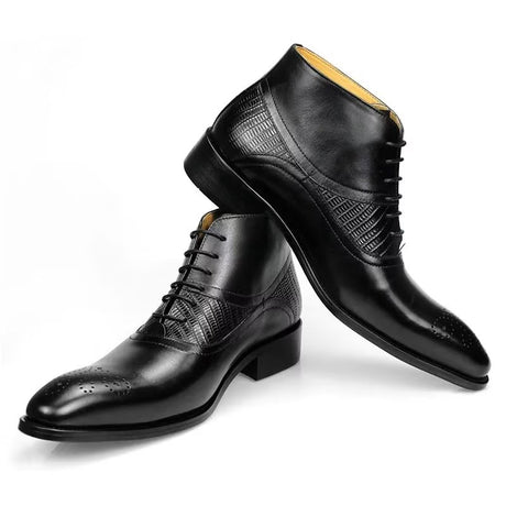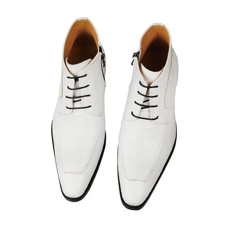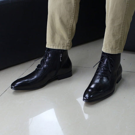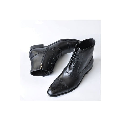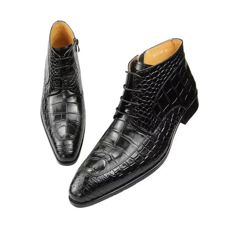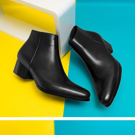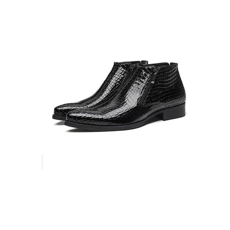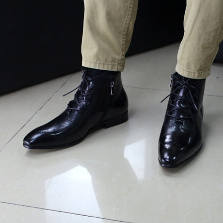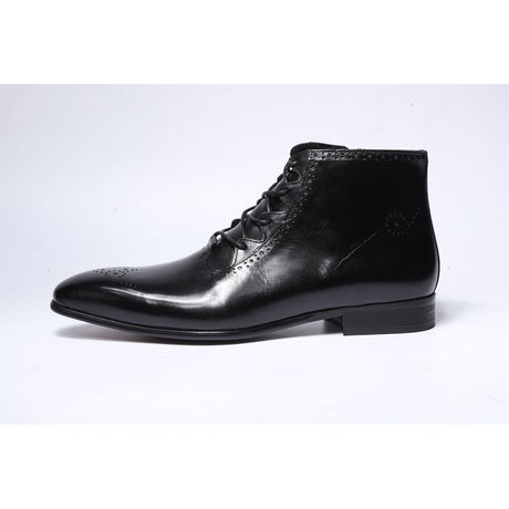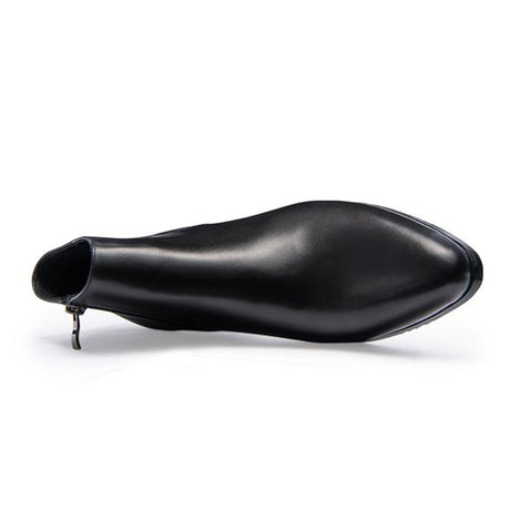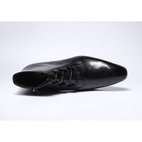 The Ostranuxe Noirelle Formal Boots are crafted from genuine cow leather with a solid pattern, featuring a lace-up closure and a pointed toe design. These ankle-height dress boots have a flat rubber outsole with a heel height of less than 0.4 inches.