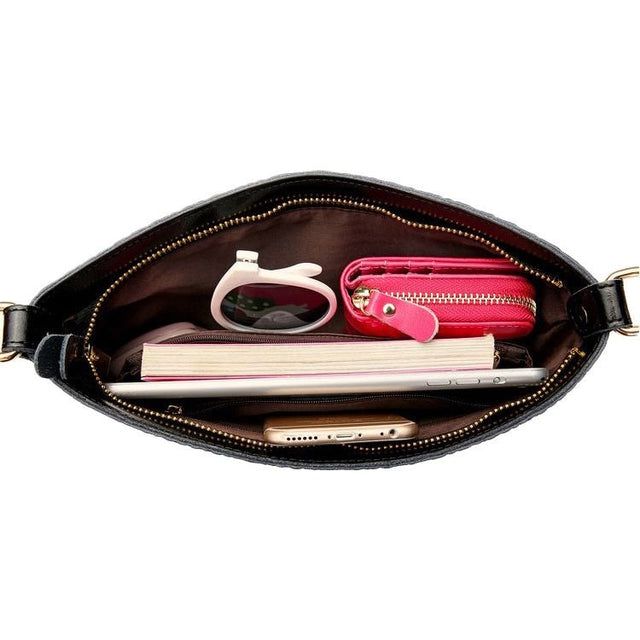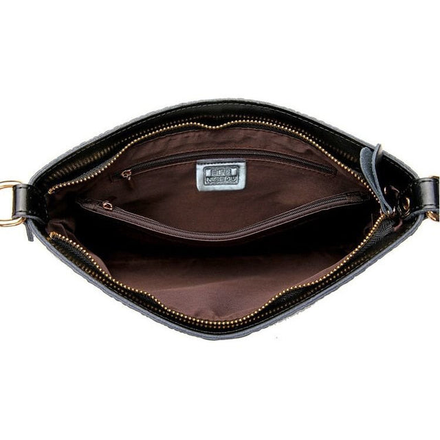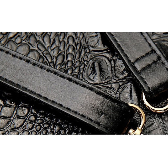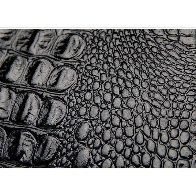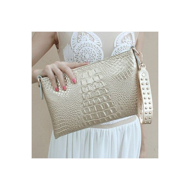 The Opulessa Chromura Handheld clutch is crafted from genuine leather with an alligator pattern, measuring 11.02 inches in width and 7.08 inches in height. It features a secure zipper closure and includes interior compartments such as a cell phone pocket, an interior zipper pocket, and an exterior silt pocket. The clutch is adorned with rivet decorations, making it a stylish choice for day use.