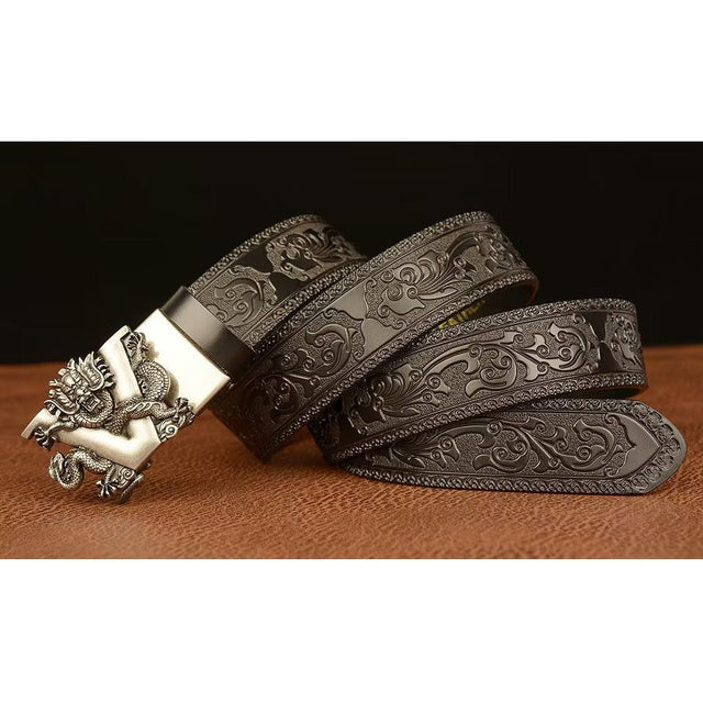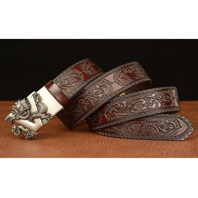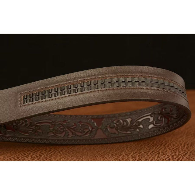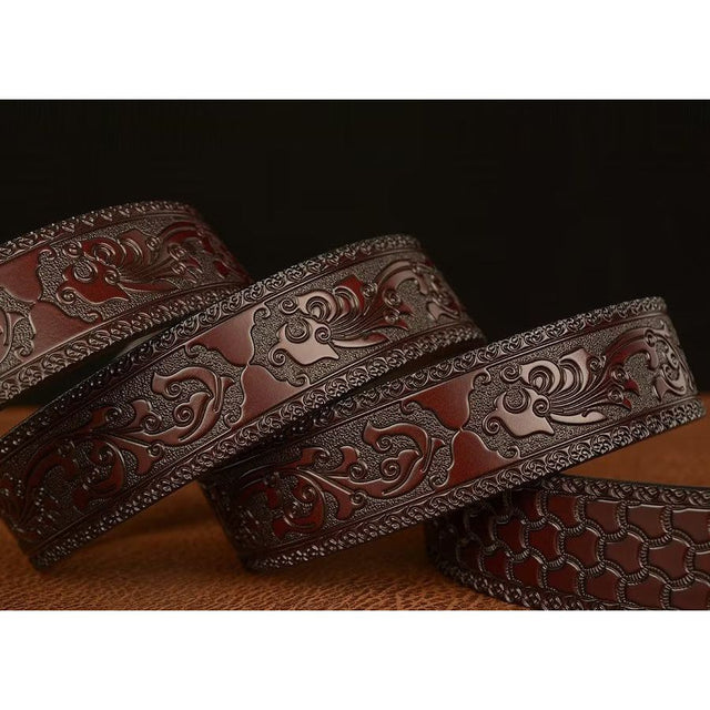 The Marbelleve Luxe Band is a fashion belt crafted from split leather with a floral pattern, featuring a metal buckle that measures approximately 2 inches in width and 2.4 inches in length.