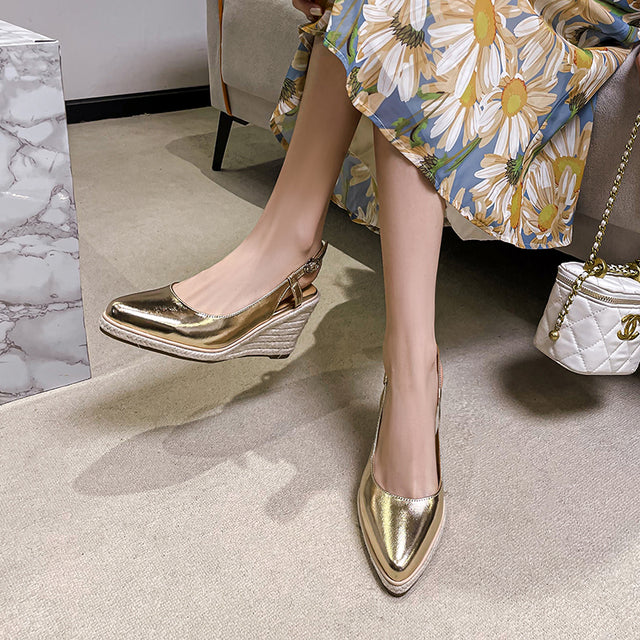 The Granderie Veltique Slip-On Wedges feature a Cowskin leather upper and a Pigskin insole, complemented by a durable rubber outsole. These wedges incorporate a platform design with a Pointed toe style, offering both style and comfort.
