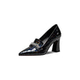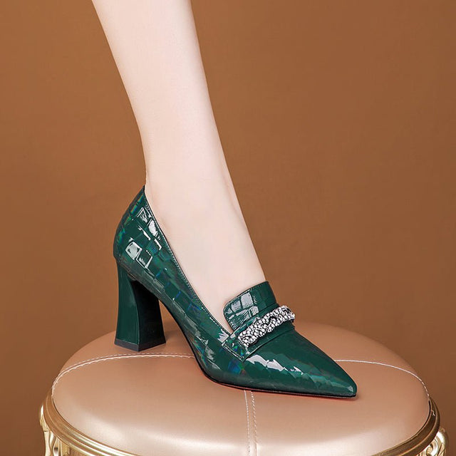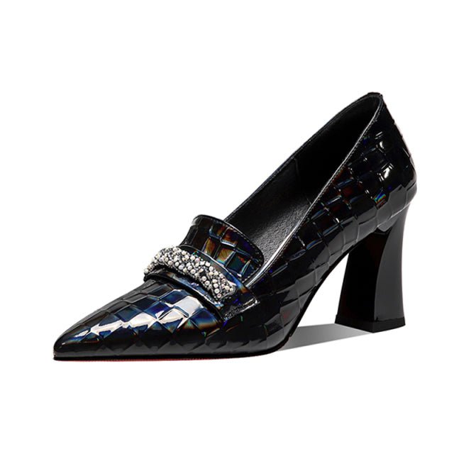 The Serpatura Effortless Elegance Heels are crafted from genuine cow leather with a solid pattern, featuring a high square heel ranging from approximately 2 to 3 inches. These slip-on heels have a pointed toe design, combining style with ease of wear.
