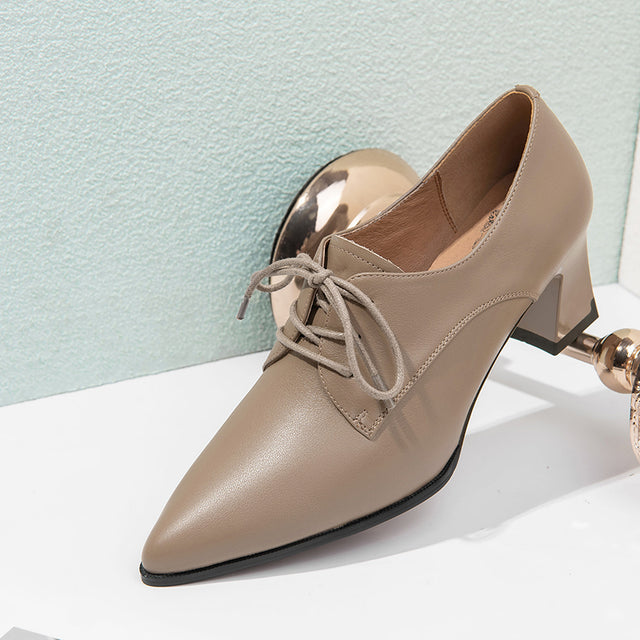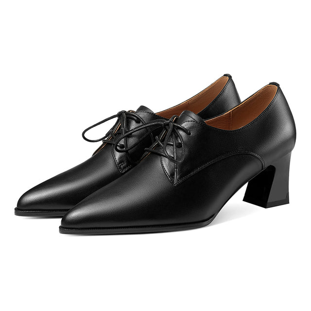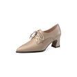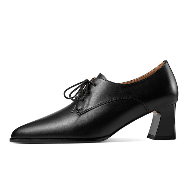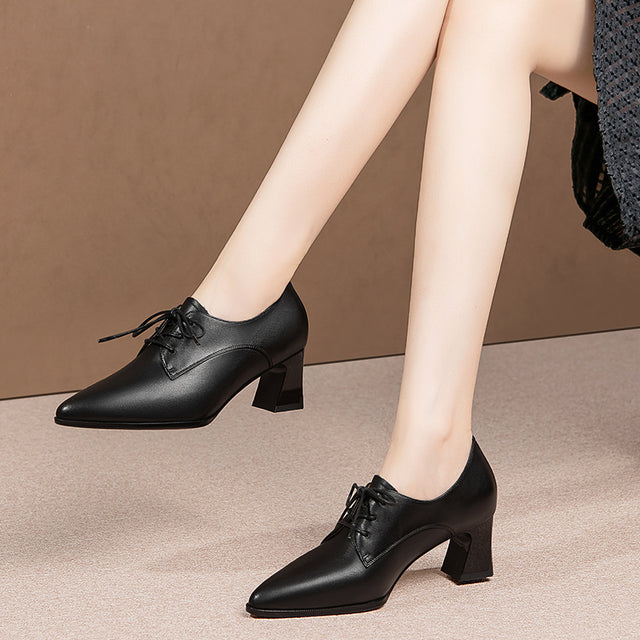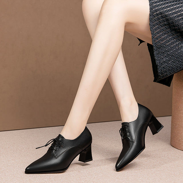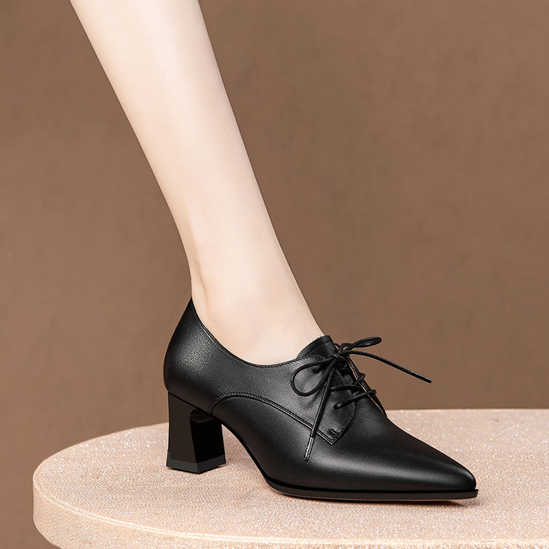 The Diamoré Classic Elegance Heels feature a cowhide upper and lining, complemented by a durable rubber insole and outsole. Designed with a pointed toe and a medium square heel measuring approximately 1.2 to 2 inches, these heels include a lace-up closure and a platform, making them suitable for both casual and formal occasions.