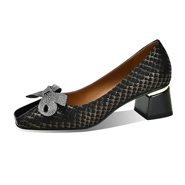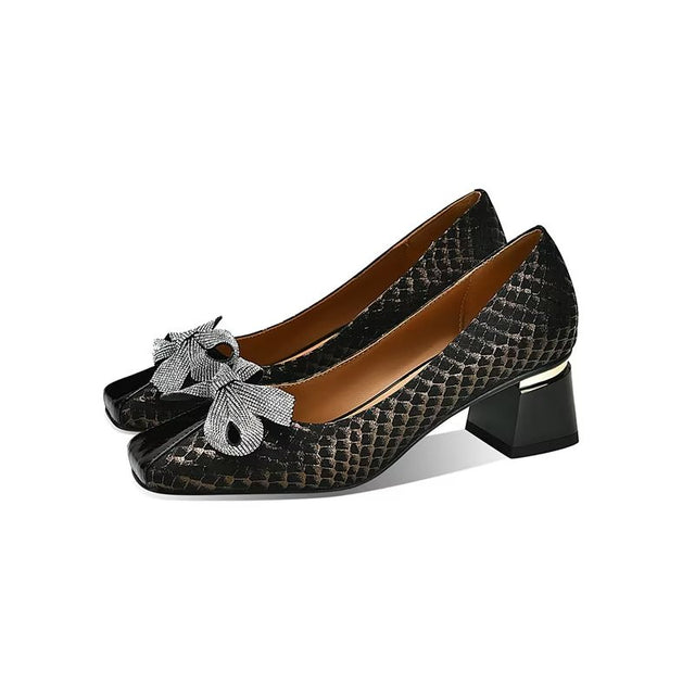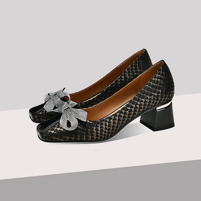 The Serpatura Elegant Office Heels feature a genuine cow leather upper and a pigskin insole, with a high square heel measuring approximately 1.77 inches. Designed with a slip-on closure and a square toe shape, these heels combine style and comfort for office wear.