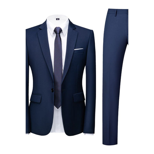 The Ostranuxe Elegance Suit is a two-piece men's suit crafted from a blend of acetate fiber and cotton, featuring a skinny fit with a single-breasted closure and a zipper fly for the pants.