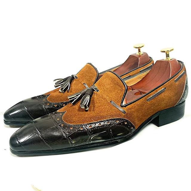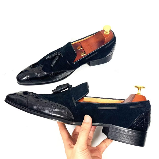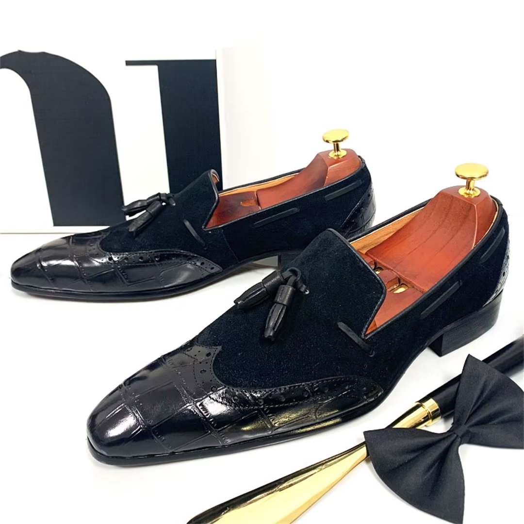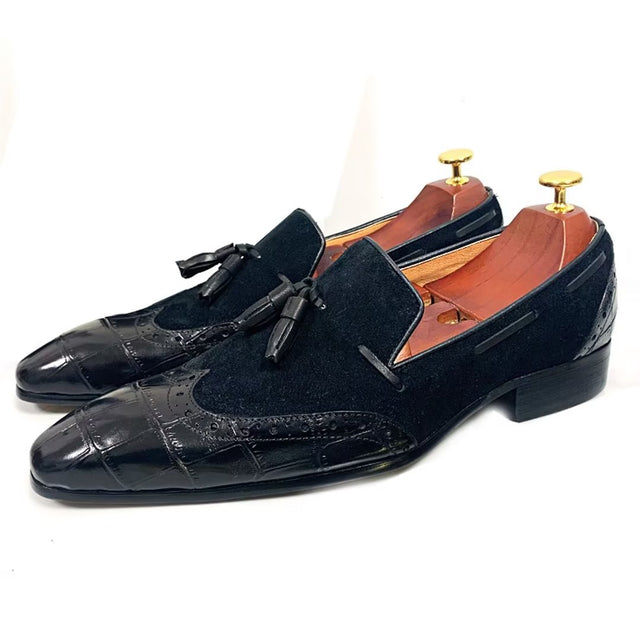 The Veloria Prime CrocLuxe Loafers feature a genuine leather upper with a solid pattern, a slip-on closure, and a pointed toe design, making them ideal dress shoes for the autumn season.