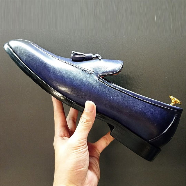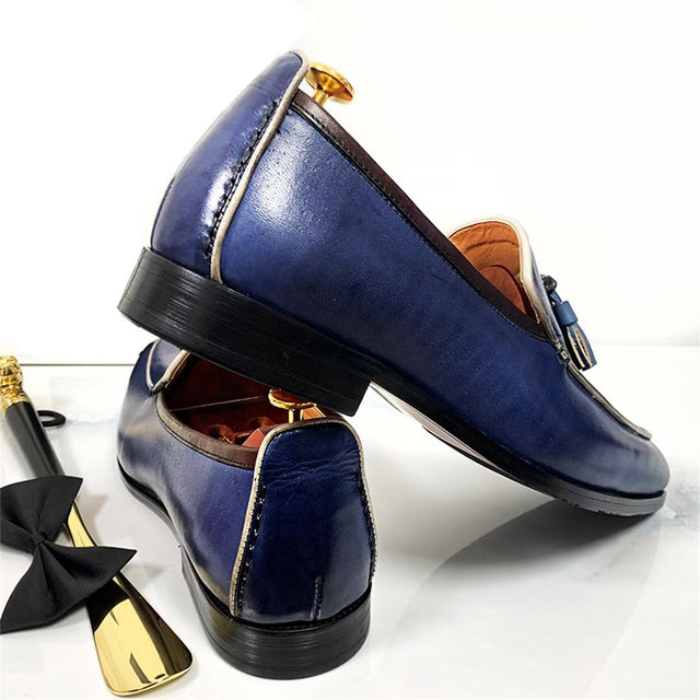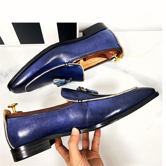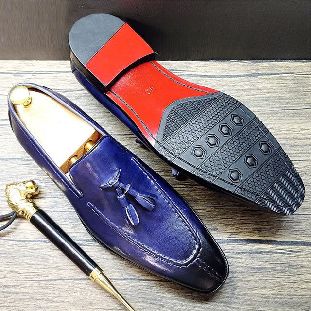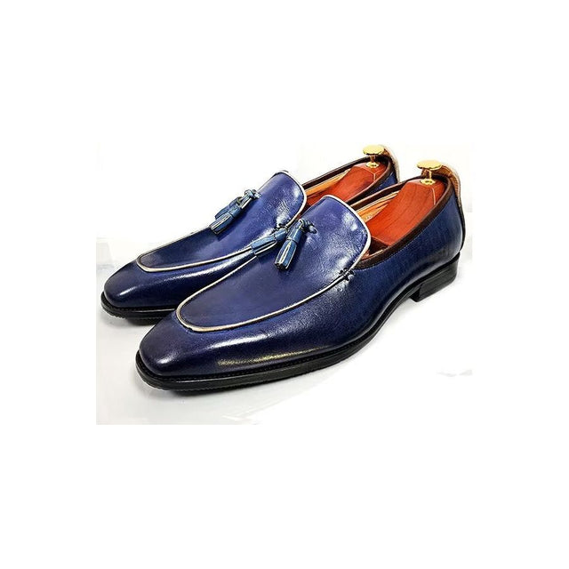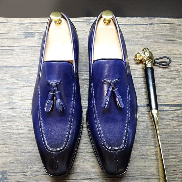 The Eldorian Slip-On Dress Loafers feature a genuine leather upper with a solid pattern and a square toe design, offering a sophisticated look. These dress shoes have a convenient slip-on closure, making them an ideal choice for formal occasions.
