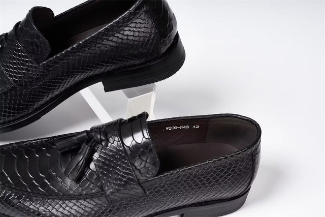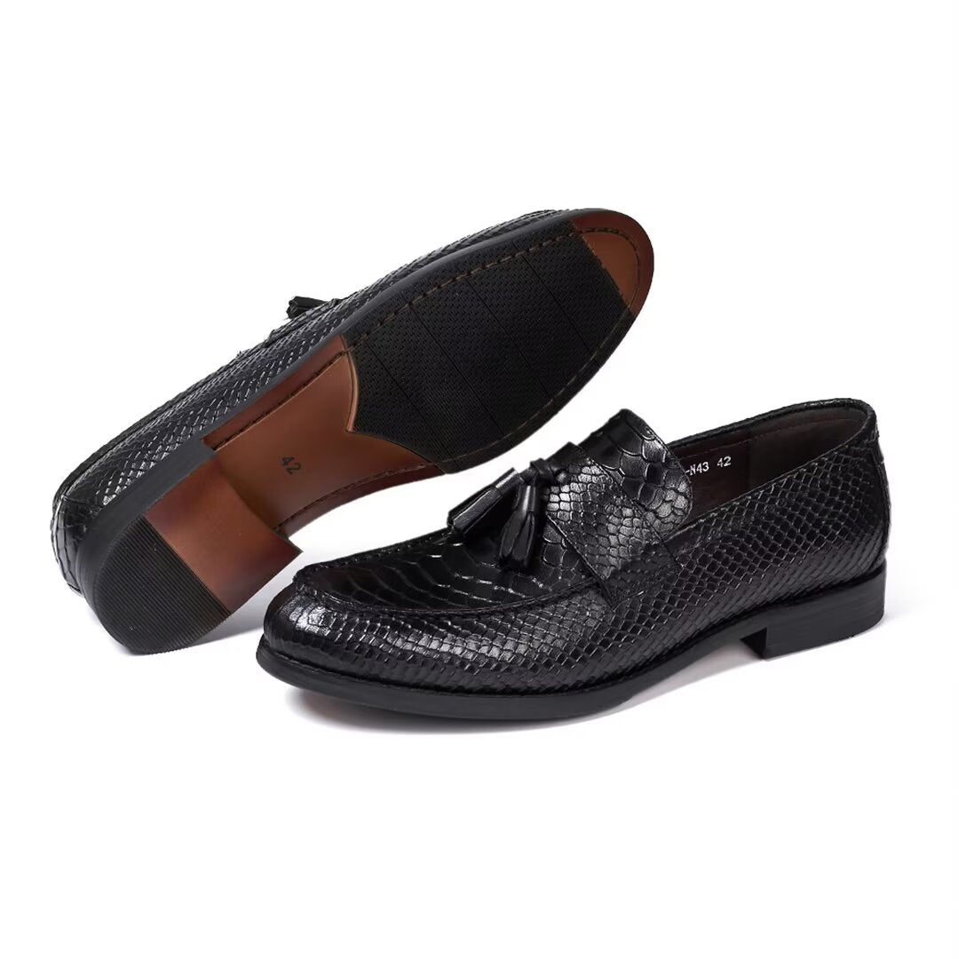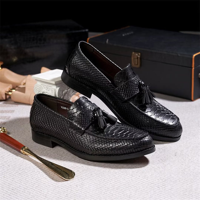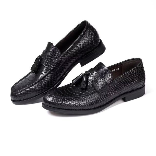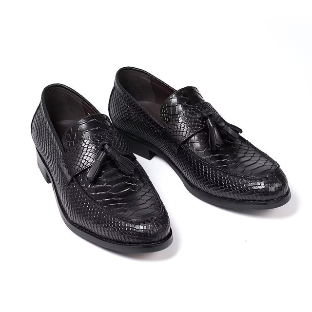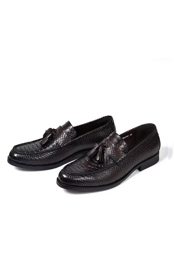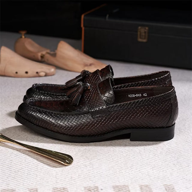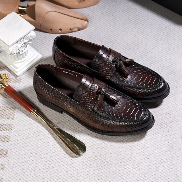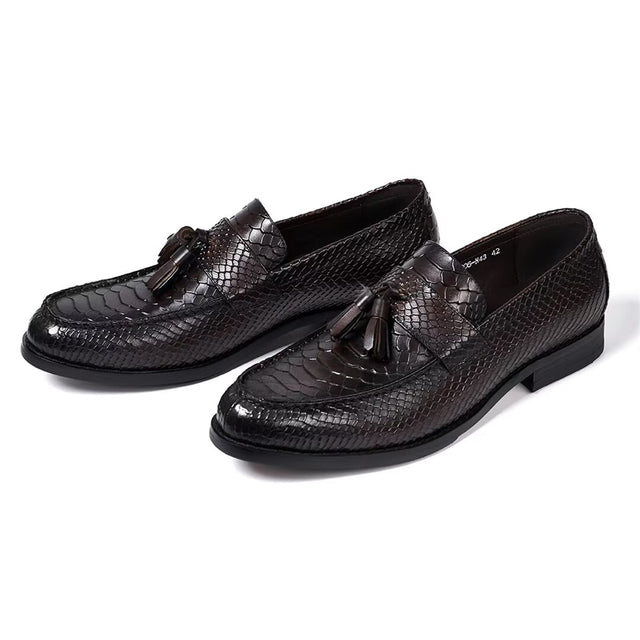 The Serpatura Effortless Elegance Loafers feature an upper crafted from genuine cow leather and a lining made of genuine pigskin leather, offering durability and comfort. These loafers have a solid pattern with a round toe design and a slip-on closure for easy wear. The rubber outsole ensures reliable traction and support.